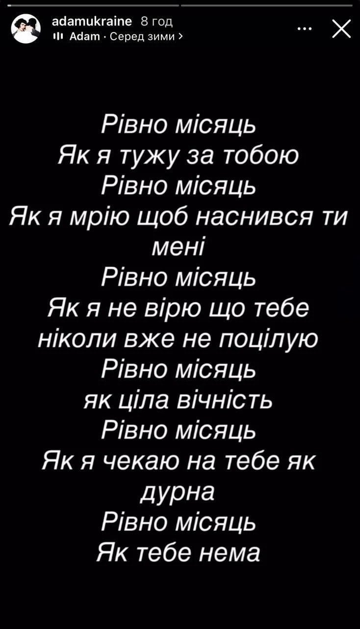 У своїх сториз Олександра відверто написала про стан, у якому перебуває після смерті чоловіка. За її словами, час не полегшив втрату, а кожен день без Михайла Клименка (справжнє ім’я ADAM) дається їй як випробування. Вдова зізналася, що досі не може повірити в те, що сталося, і живе з відчуттям постійного очікування.