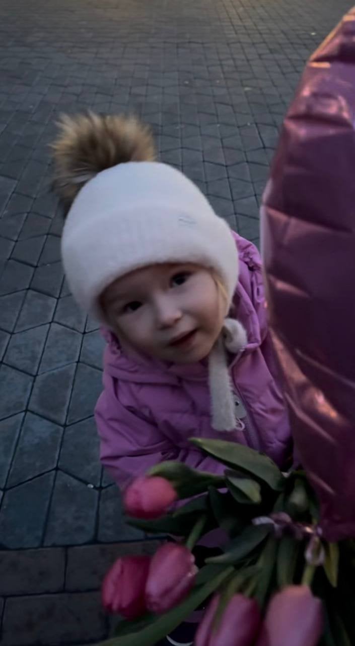 Окрім того, подружжя показало й свою донечку Аґату. Дворічна дівчинка з’явилася в кадрі з букетом тюльпанів і повітряною кулькою у формі серця, прямуючи просто до камери.