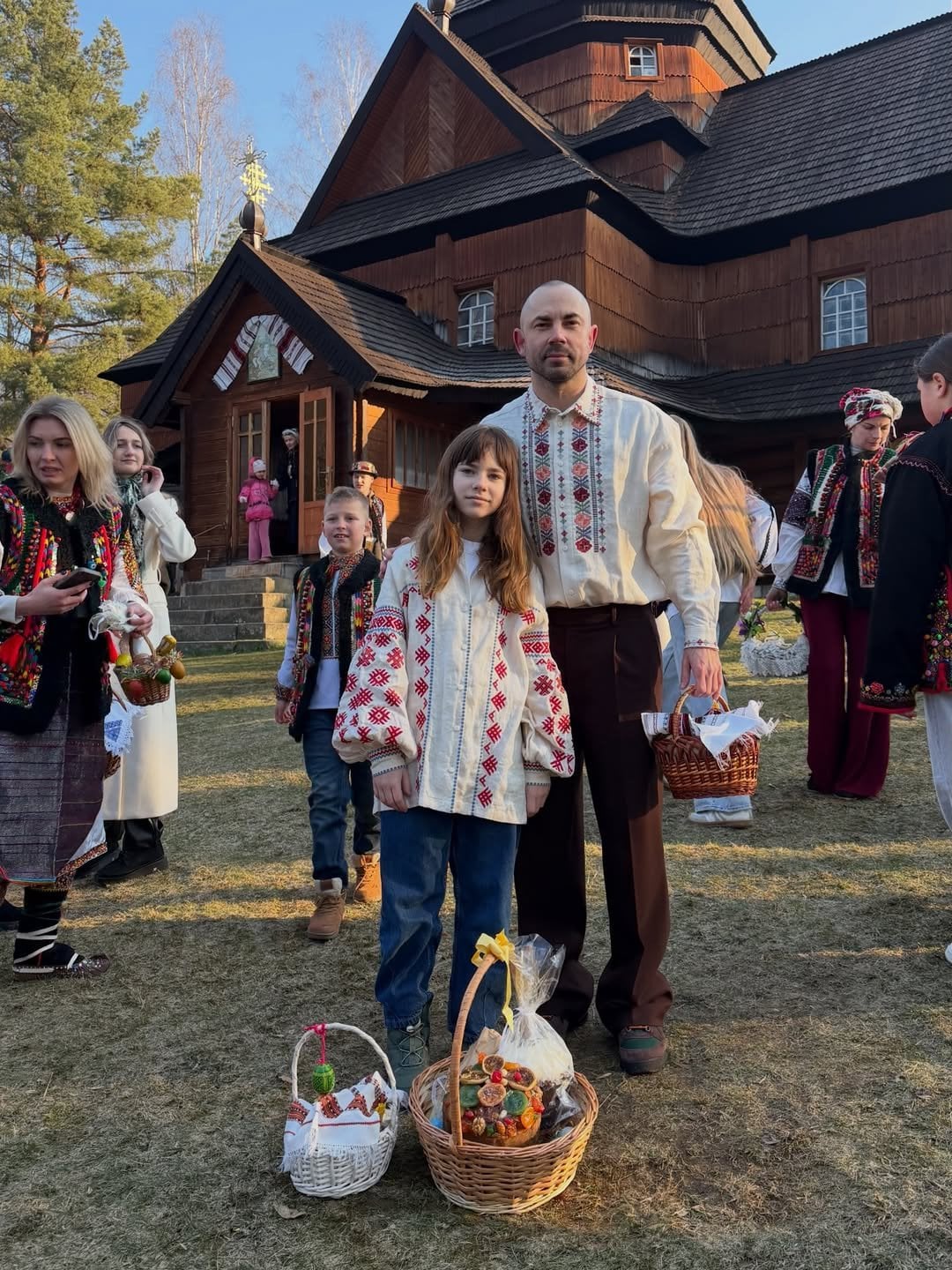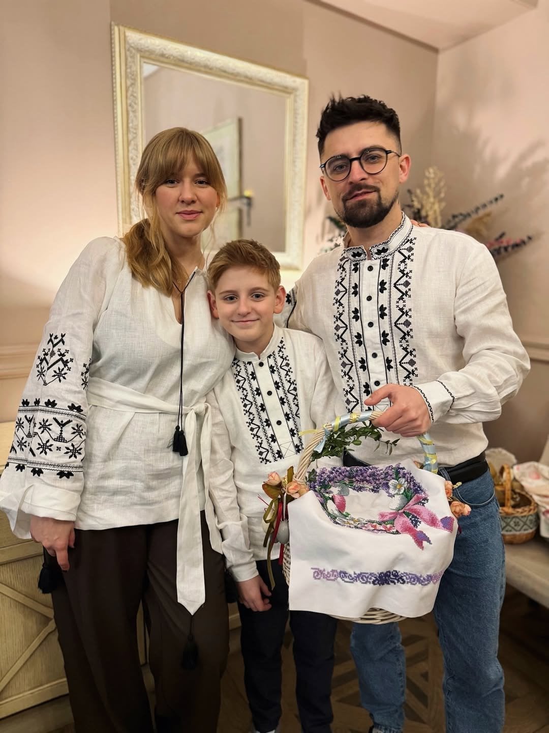 Виконавець показався з дружиною та сином. Вони одягнули family look – білі вишиванки. З великоднім кошиком у руках артист побажав у кожну домівку побільше світла та тепла.