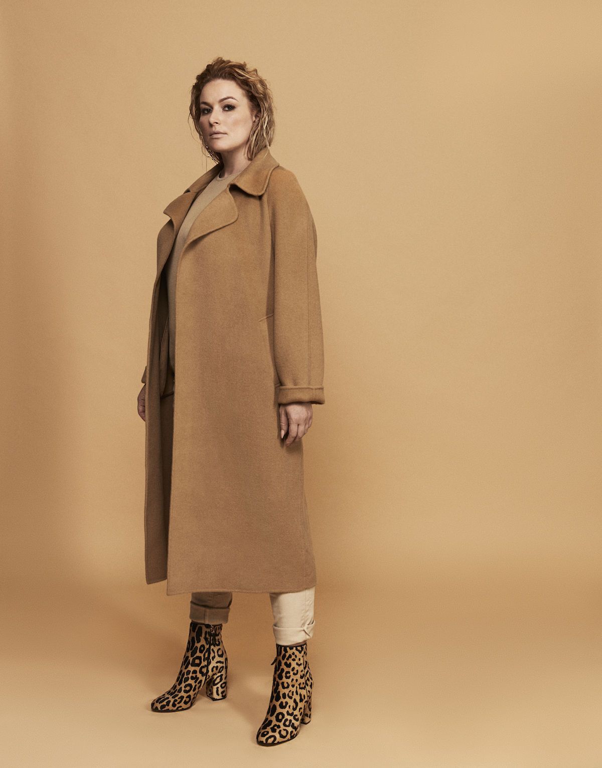 На фото Тетяна постала в пальті "оверсайз" і штанях пісочних відтінків, а стильний образ доповнили ботильйони з леопардовим принтом і великі золотисті сережки. Вбрання моделі підкреслило її жіночні форми.