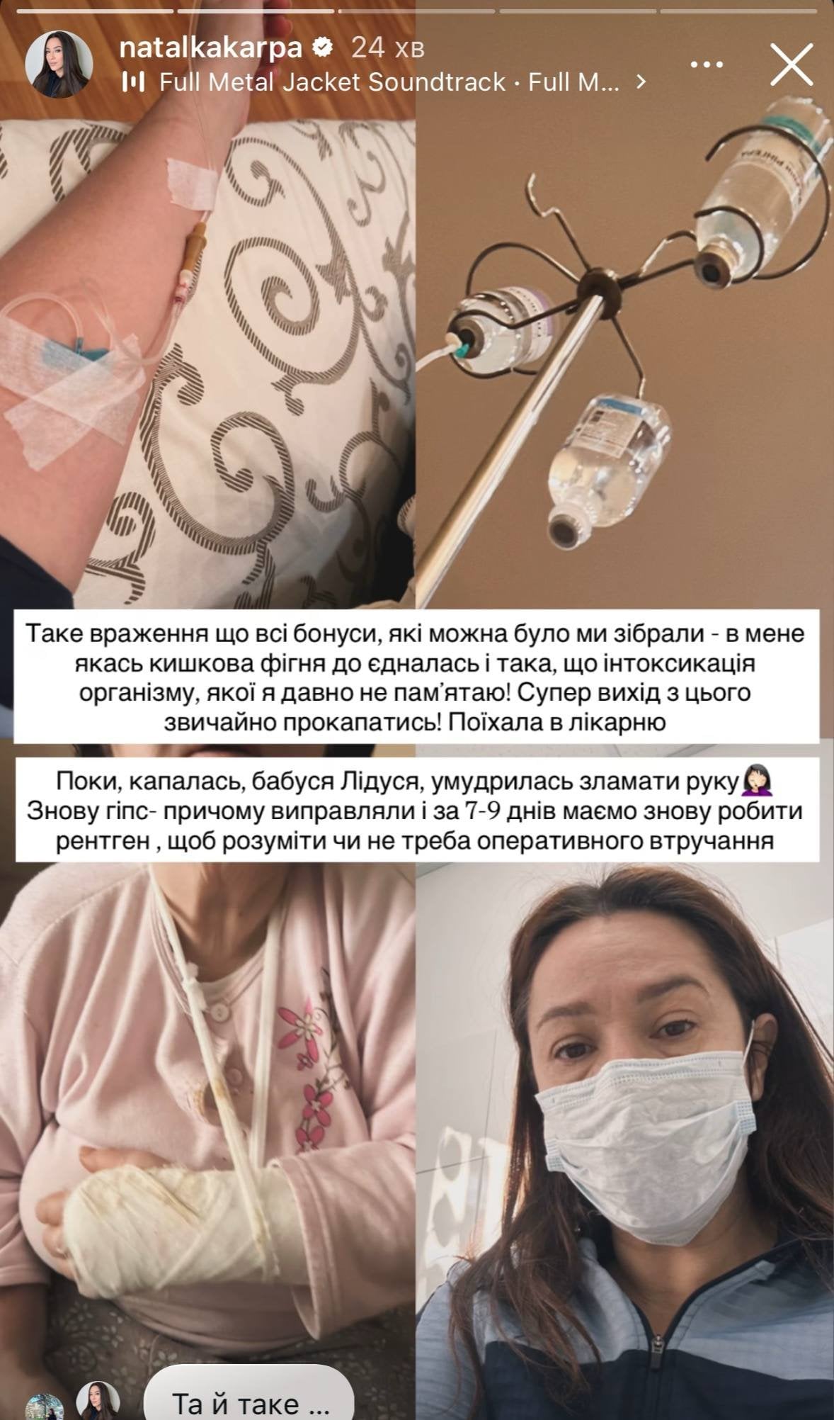 У своєму фотоблогу Карпа неочікувано показалася в медичній масці з крапельницею в руці. Зірка повідомила, що потрапила до лікарні через інфекційну хворобу, яка спричинила сильну інтоксикацію організму. За словами Наталки, стан був настільки важким, що без стаціонарного лікування обійтися не вдалося.