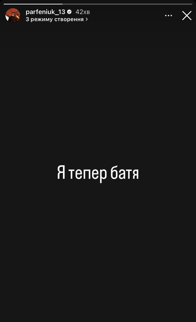 Про народження первістка виконавець повідомив у сторіз своєї сторінки в Instagram. Він розмістив коротке повідомлення з текстом: “Я тепер батя”.