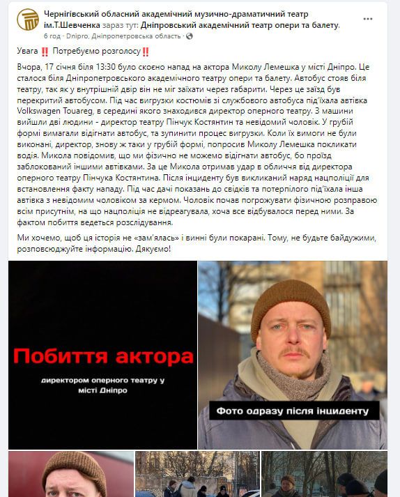 Допис про побиття актора Миколи Лемешка / © facebook.com/ChernihivTheatre