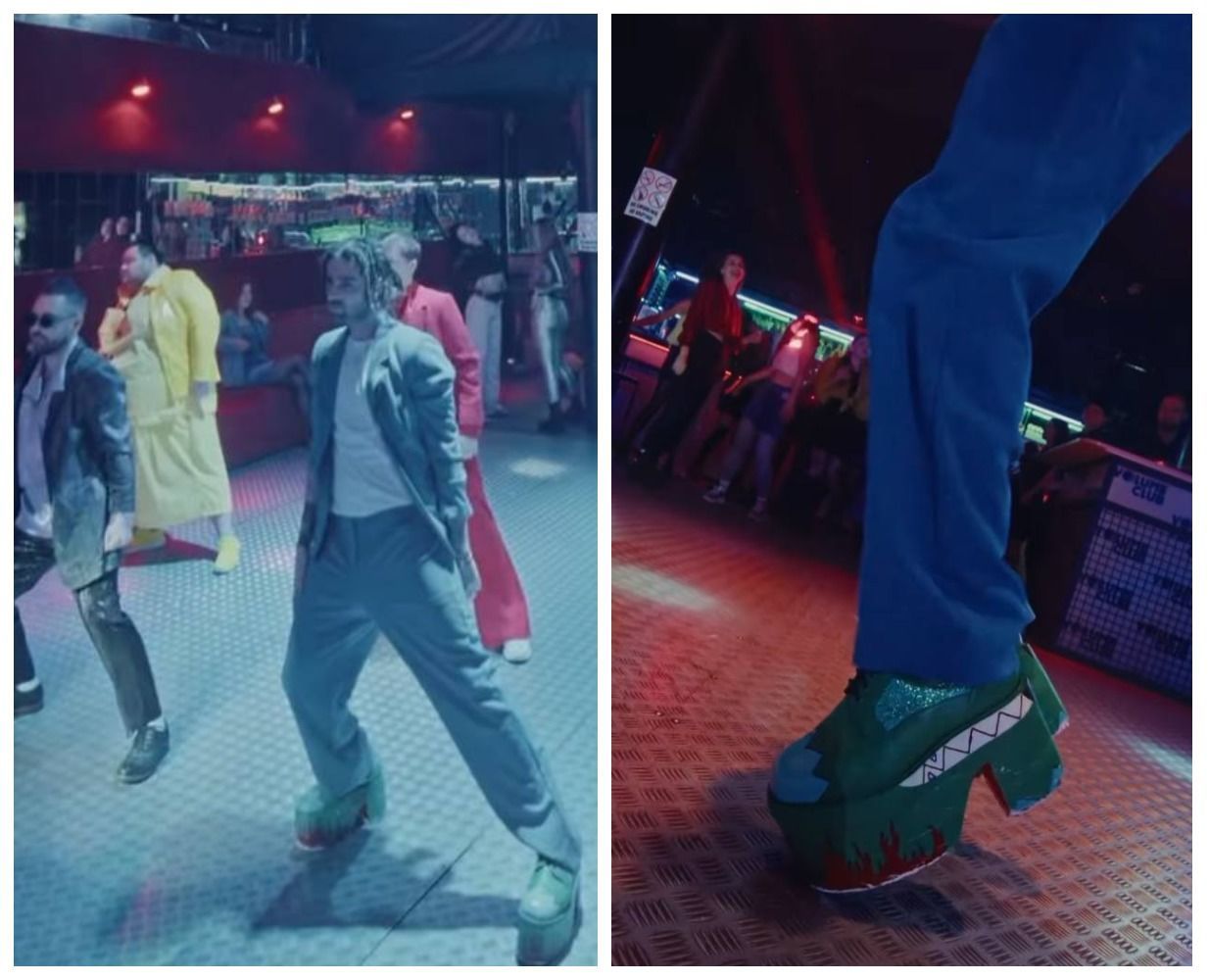 Цікаво, що на одному з кадрів можна побачити, як співак виконує танцювальні рухи у взутті на дуже високій платформі.