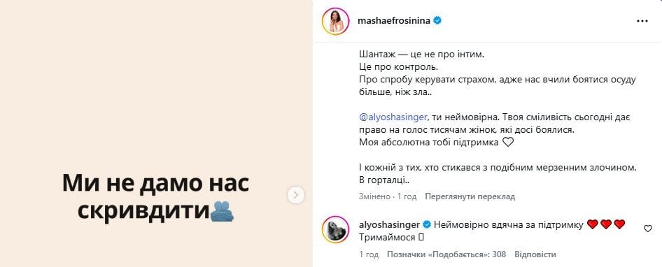 «Сьогодні Олена Тополя зробила те, що десятиліттями вважалося неможливим: вона перетворила зброю шантажиста на його ж вирок. Це напад не на одну жінку — це атака на гідність кожної з нас. Шантаж — це не про інтим. Це про контроль. Про спробу керувати страхом, адже нас вчили боятися осуду більше, ніж зла. Олено, ти неймовірна. Твоя сміливість сьогодні дає право на голос тисячам жінок, які досі боялися. Моя абсолютна тобі підтримка», — написала Єфросиніна.