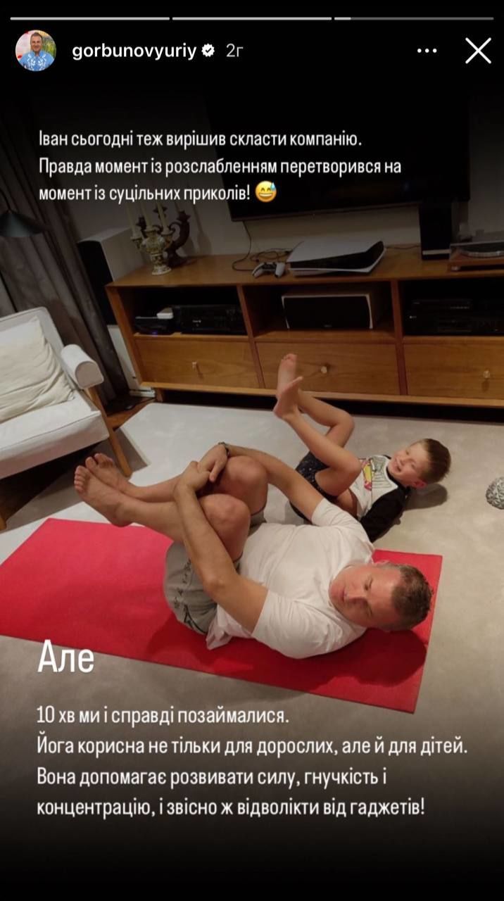 "Іван сьогодні теж вирішив скласти компанію. Щоправда, момент із розслабленням перетворився на момент із суцільних приколів! Але 10 хв ми і справді позаймалися. Йога корисна не тільки для дорослих, але й для дітей. Вона допомагає розвивати силу, гнучкість і концентрацію, і звісно ж відволікти від ґаджетів!", - наголосив Юрій.