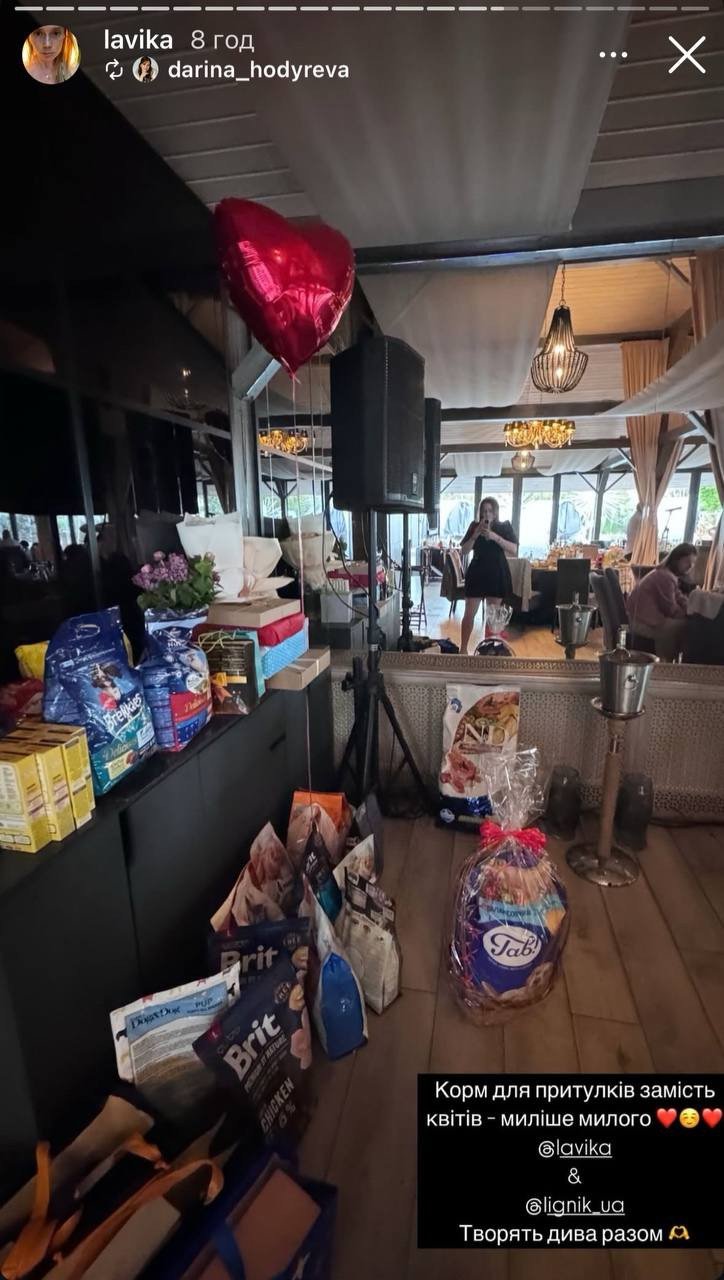 До слова, привітати молодят зі створенням родини прийшло чимало гостей. Зокрема, серед найближчих пари можна було розгледіти співака Влада Дарвіна та ведучу Соломію Вітвіцьку. До речі, у всіх гостей подружжя попросило замість квітів дарувати їм корм для безпритульних тварин, що вони й виконали.