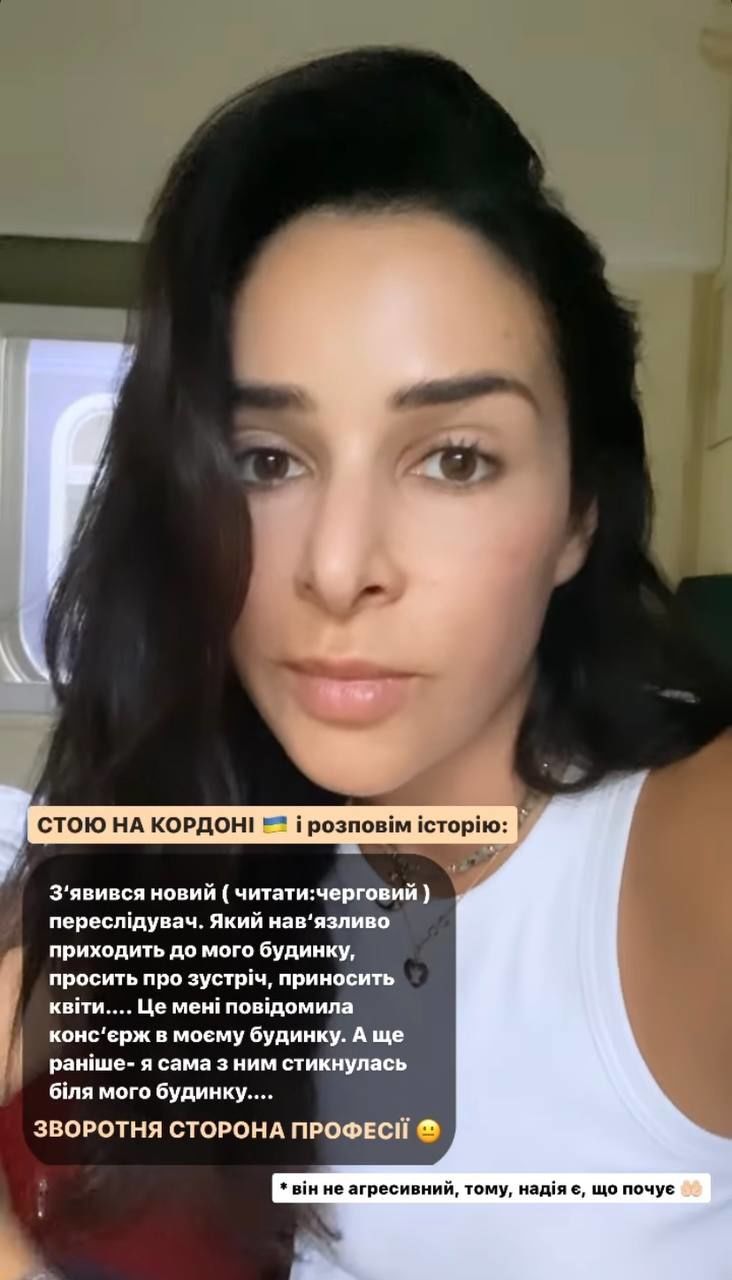 "З'явився новий переслідувач. Він не такий агресивний, як інші. Але він нав'язливо приходить до мого будинку, приносить квіти, нав'язливо просить про зустріч. Мені це все неприємно. Але я сподіваюсь, бо він не такий агресивний, я зможу йому пояснити, що цього робити не варто. Про це мені повідомила мені моя консьєрж", - поділилася співачка.