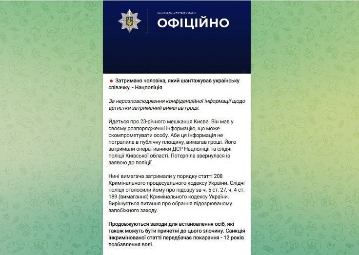 Національна поліція України повідомила про затримання 23-річного мешканця Києва, який, за даними слідства, намагався нажитися на приватних відео артистки. Чоловік вимагав у співачки 75 тисяч доларів за те, аби компрометаційні кадри не з’явилися у відкритому доступі. Втім, попри це, відео все ж потрапило до Мережі.