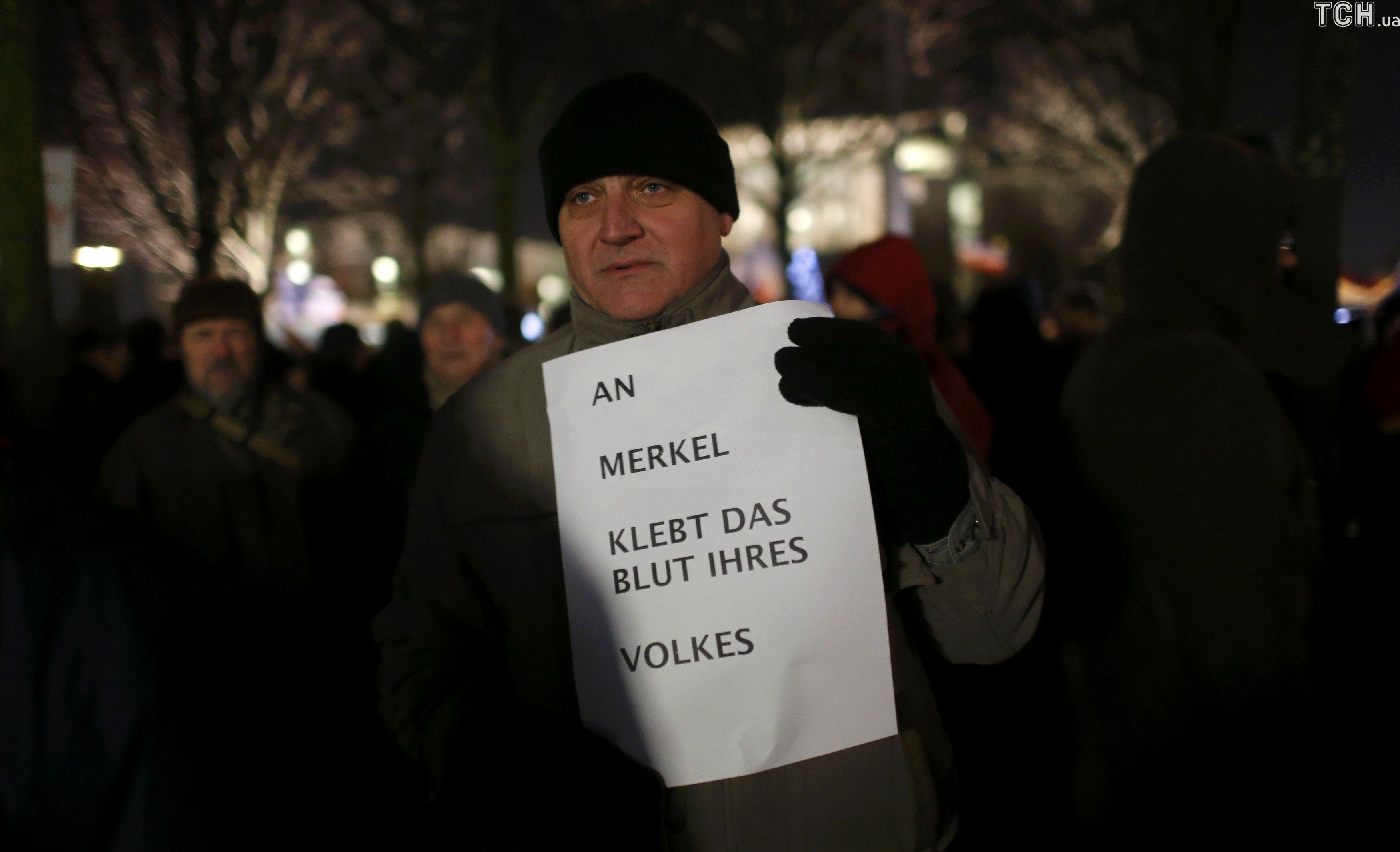 Прихильник партії Альтернатива для Німеччини тримає плакат "На руках Меркель кров її людей" / © Reuters