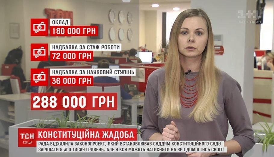У новому законі йдеться про оклад у 75 прожиткових мінімумів. Це - 120 тисяч гривень. Але це ще далеко не все. Саме для суддів Конституційного суду діятиме спеціальний коефіцієнт, тобто зарплати просто збільшуються у півтора разу. Тобто оклад становитиме 180 тисяч гривень. Сюди ж плюсуються надбавка за стаж роботи до 72 тисяч гривень та за науковий ступінь - 36 тисяч. Усе разом - 288 тисяч гривень.
