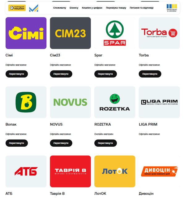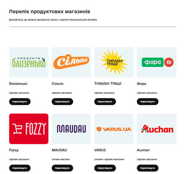 Зауважимо, на сайті «Зимової підтримки» наголошують, що перелік магазинів, де можна витрачати гроші з картки «Національний кешбек» постійно оновлюється. Наразі це: