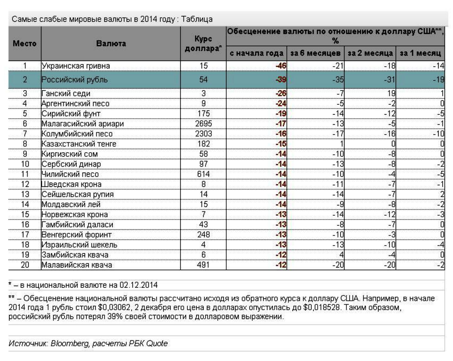 Рейтинг склало російське агентство РБК на основі даних Bloomberg. Знецінення національної валюти розраховане виходячи зі зворотного курсу до долара США - не скільки коштує один долар, а скільки доларів (скоріше центів) коштує одна гривня чи інша валюта.
