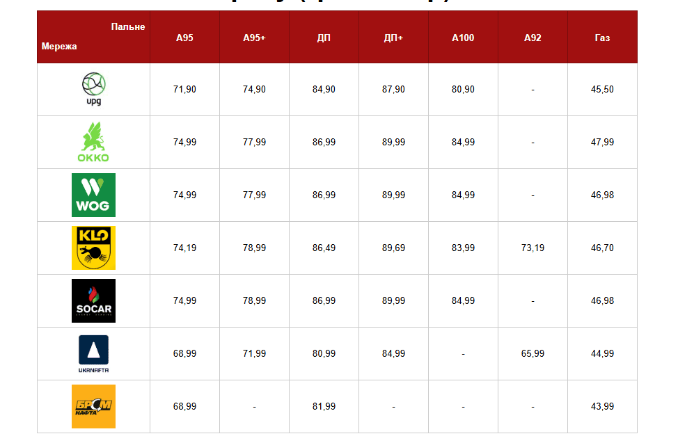 За добу ціни на пальне фактично не змінилися. Найдорожчий бензин А-95 та дизель — у мережах OKKO, WOG та Socar. Найдешевше пальне — «Укрнафта» та «БРСМ-Нафта».