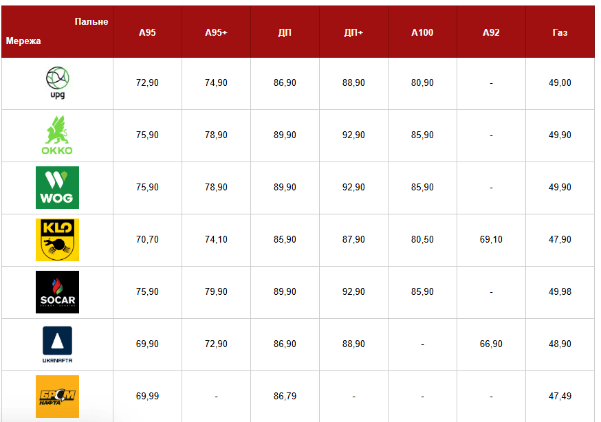 бензин А-95+: 72,90 — 78,90 грн;