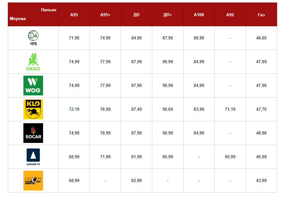 Середня вартість бензину А-95 на автозаправках не змінилася і становить близько 72,43 грн за літр. Найдорожче пальне цієї марки обійдеться на ОККО, WOG та Socar — 74,99 грн. Найменший цінник на «Укрнафті» і на «БРСМ-Нафті» — 68,99 грн.