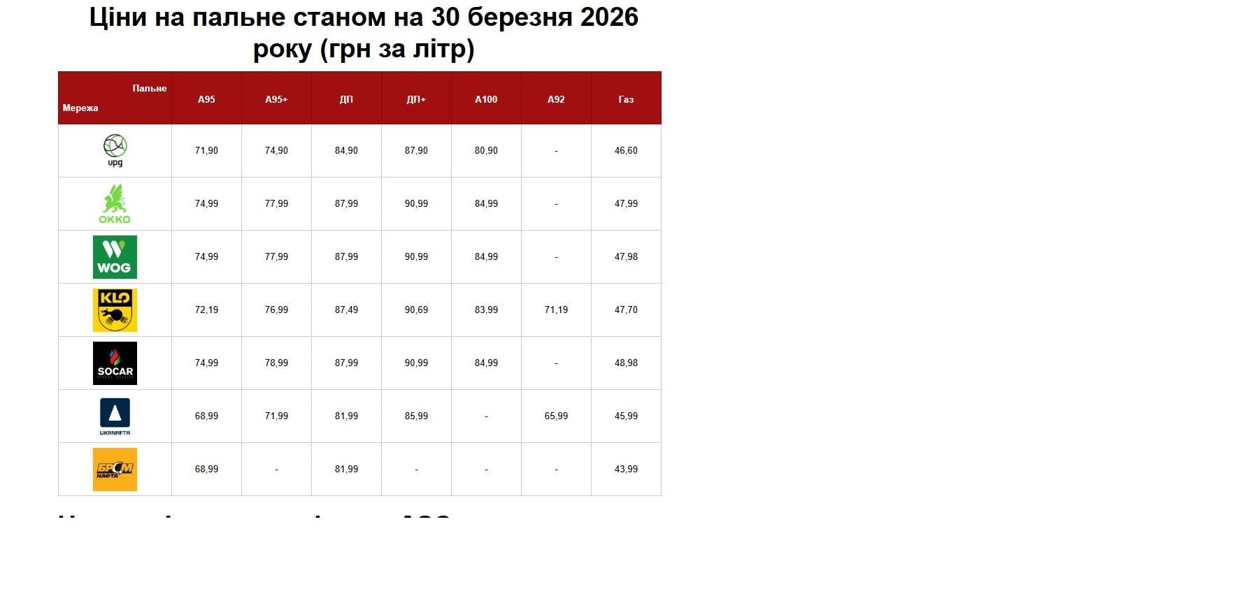 Станом на 30 березня 2026 року найбільші мережі АЗС в Україні оновили ціни на пальне.