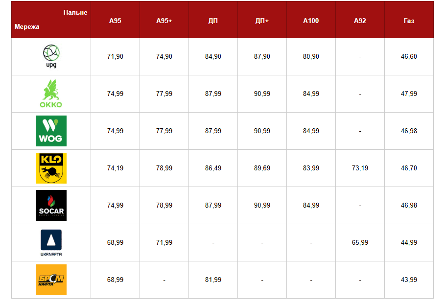 Середня вартість бензину А-95 не змінилася і становить близько 72,72 грн за літр. Найдорожче пальне цієї марки коштує на OKKO, WOG і SOCAR — 74,99 грн. Найдешевше - на «Укрнафті» і «БРСМ-Нафті» — 68,99 грн.