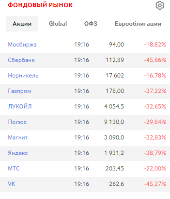 Падають акції російських компаній. Найбільше падіння в "Сбербанка" - мінус 44%.