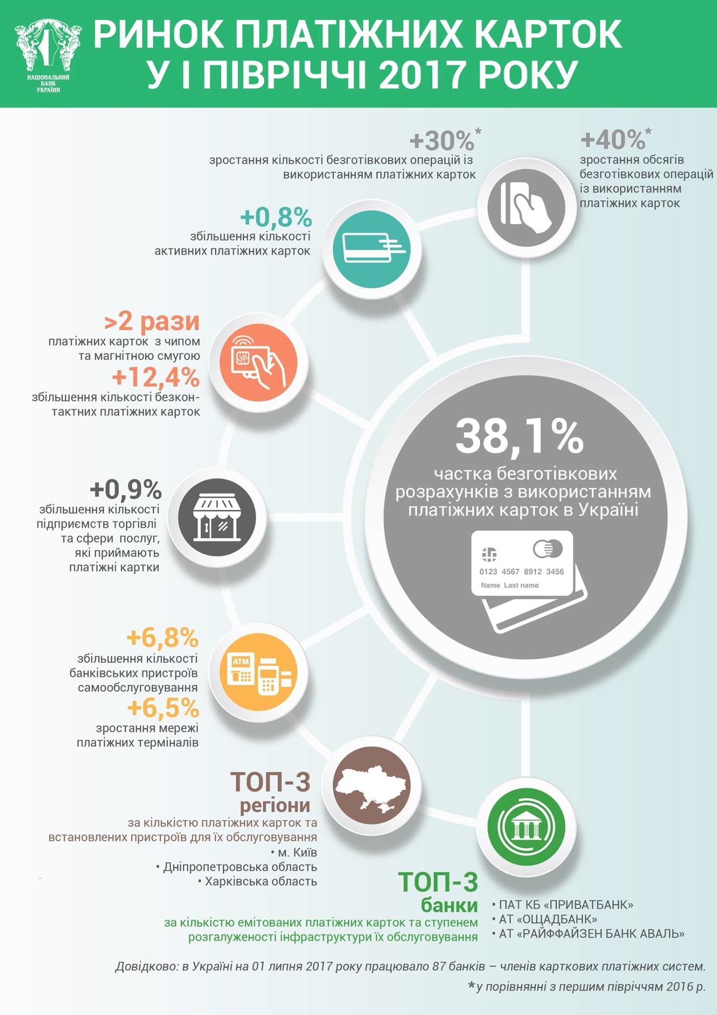Загальна кількість операцій із використанням платіжних карток, емітованих українськими банками, за перше півріччя становила 1,43 млрд штук, а їхній обсяг – понад 908 млрд грн. Порівняно з першим півріччям 2016-го зросли відповідно на 23% та 28%.
