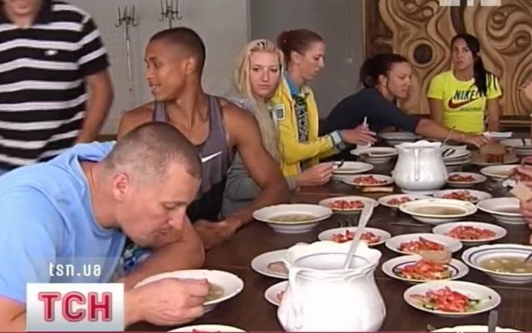 У їдальні радянського типу спортсмени стоять у чергах і самі розносять собі суп та салати. Підживитися чимось іще вони б і раді, але, на базі продукти швидко зіпсуються, адже кондиціонерів і холодильників немає. Та й крамниць поблизу також не спостерігається, а їхати по харчі до Києва заборонено – порушення режиму.