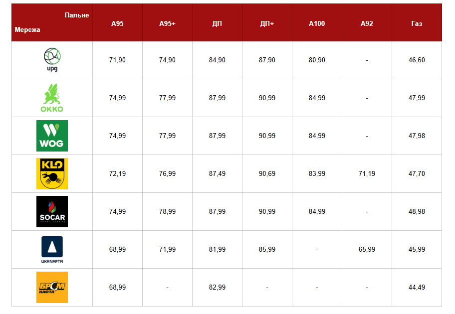 Середня вартість бензину марки А-95 становить близько 72,43 грн за літр. Найдешевше це пальне обійдеться на «Укрнафті» і на «БРСМ-Нафті» — 68,99 грн. На шість гривень дорожчий А-95 на ОККО, WOG та Socar.