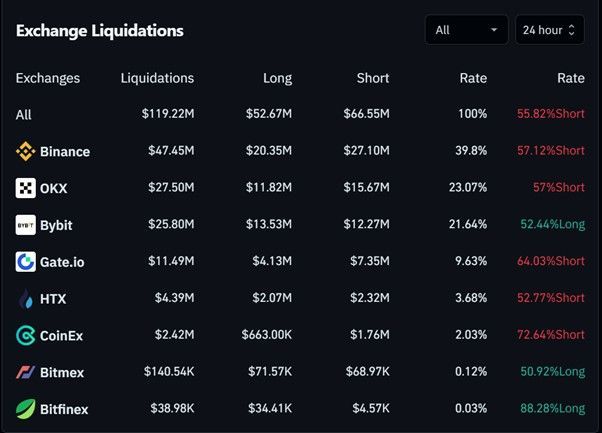 Загальний обсяг ліквідацій склав $356,80 млн, з яких $272,97 млн припало на шорт-позиції (76,51%), а $83,83 млн – на лонги (23,49%). Такий розподіл вказує на те, що більшість трейдерів, які ставили на падіння ринку, зазнали втрат, що, ймовірно, було спричинене несподіваним зростанням цін криптовалют.