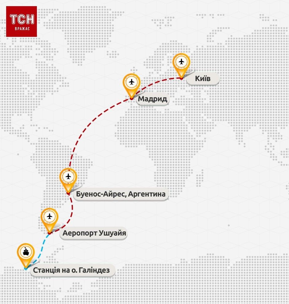 - Спочатку летять до Європи (Париж, Мюнхен або Мадрид), далі трансатлантичним рейсом до Буенос-Айреса, Аргентина, там пересадка на місцеві авіалінії та переліт до аеропорту Ушуайя, де вже чекає судно. А там 1,5 тисячі кілометрів і три дні до станції.