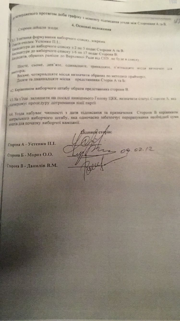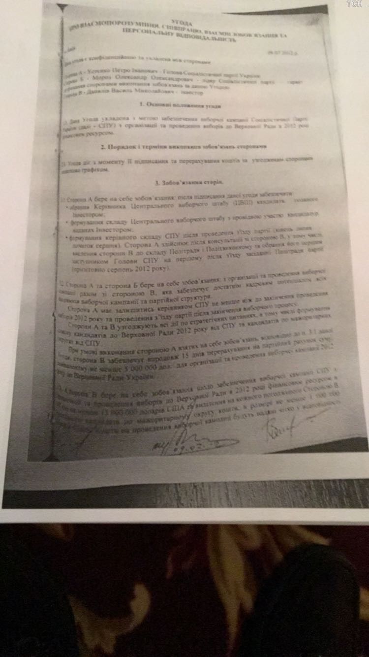 - Я домовився з Олександром Морозом, тодішнім лідером Соцпартії, що я стану її інвестором напередодні виборчої кампанії 2012 року і доведу Соцпартію до прохідного бар'єру в ВР у 5-7%. Ми б розмили голоси Компартії та Партії регіонів. Про мої наміри забрати Соцпартію були поінформовані Турчинов і найближче оточення Тимошенко. Я підписав цей договір з Олександром Морозом і Петром Устименком 9 липня 2012 року. Мене одразу обрали головою передвиборчого штабу Соцпартії.