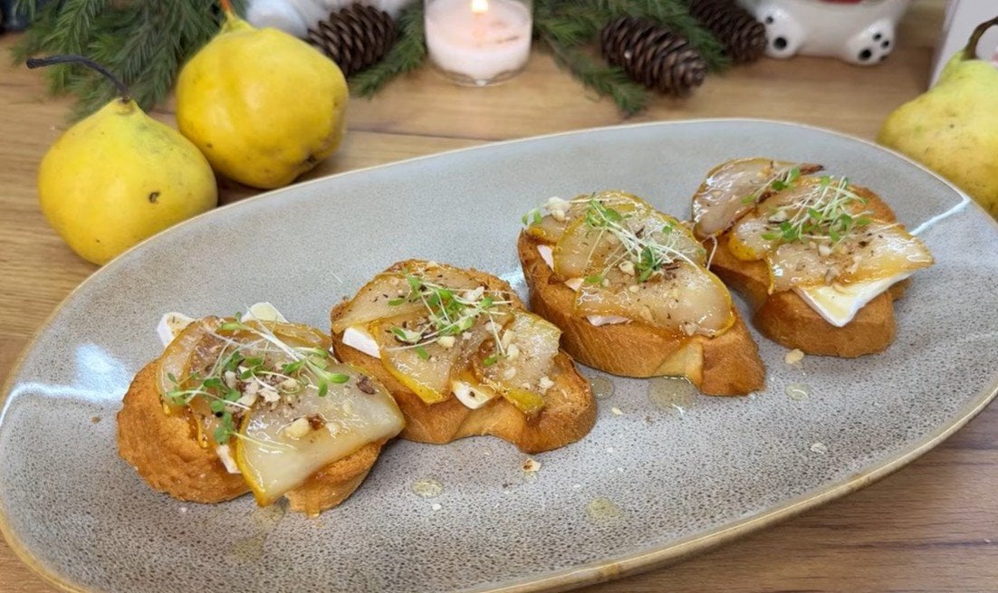На кожну ще теплу грінку покладіть шматочок сиру — від температури хліба він почне злегка підтавати. Зверху викладіть кілька шматочків карамелізованої груші.
