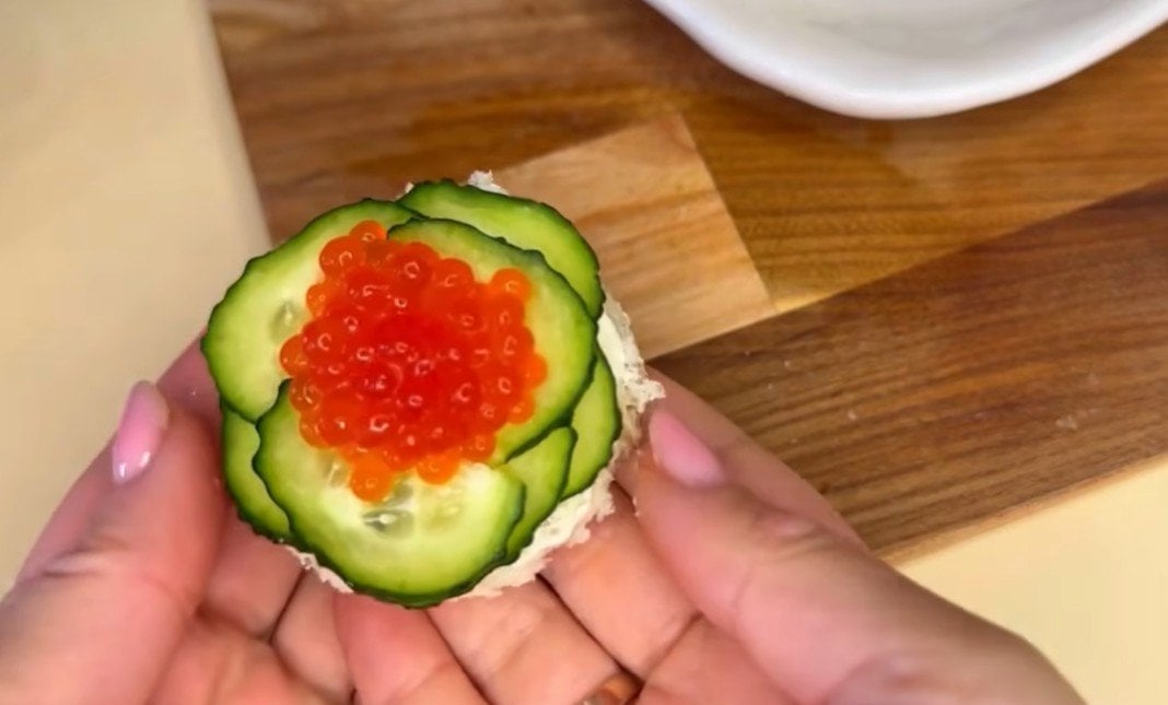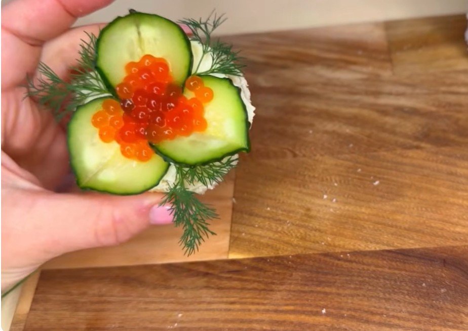 На одну канапку знадобляться три такі заготовки. Розгорніть їх і викладіть на хліб у формі трьох пелюсток, що розходяться з центру. Всередині кожної утвореної «кишеньки» огірка викладіть трохи червоної ікри. Щоб завершити образ, додайте невелику гілочку зелені, яка підкреслить контраст кольорів.