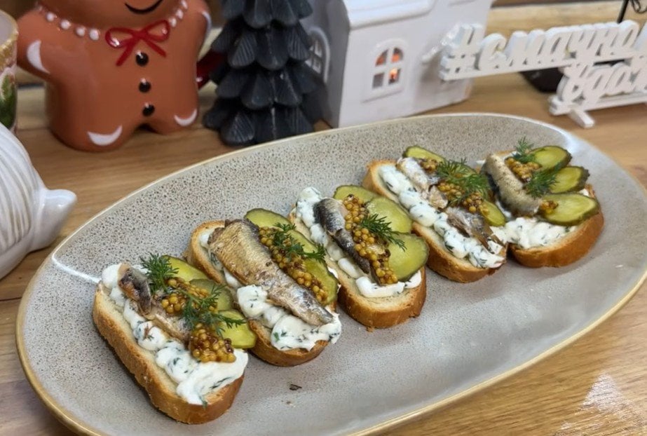 Завершується оформлення кількома деталями: зверху на соус викладіть по три тонкі скибочки маринованого огірка та одну цілу рибину. Останній штрих — маленька крапля зернистої гірчиці між шпротою та огірком. Гірчиця надасть легкої гостроти та зробить вигляд закуски більш сучасним.