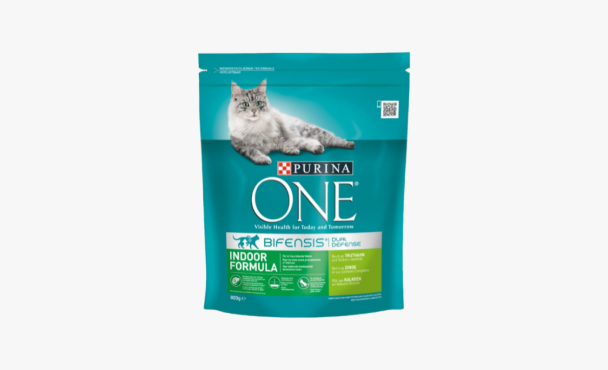 Корм для котів Purina One з indoor формулою відноситься до спеціалізованої лінійки і розроблений спеціально для профілактики цих проблем. Він містить 34% білків, 13% жирів, 6% клітковини, 2% Омега-6, калорійність 100 г корму 347 ккал. До його складу входять: