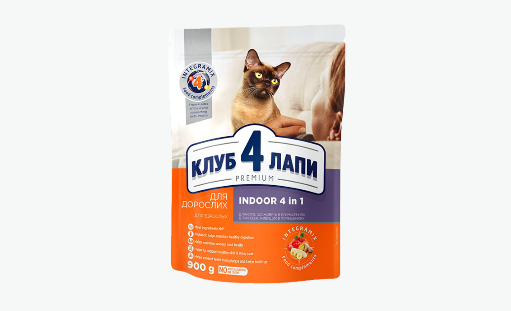 Якщо потрібен якісний і не дуже дорогий корм для кішок, які не виходять на вулицю, Клуб 4 Лапи Indoor 4 in 1 буде більш ніж гідною заміною для Purina One Indoor. Раціон розроблений спеціально для профілактики 4 поширених проблем домашніх кішок, багатий на білки тваринного походження, містить цінні рослинні інгредієнти, жирні кислоти й амінокислоти. Корм можна купити в офлайн і інтернет-магазинах, а ціна його, незважаючи на війну, залишається доступною.