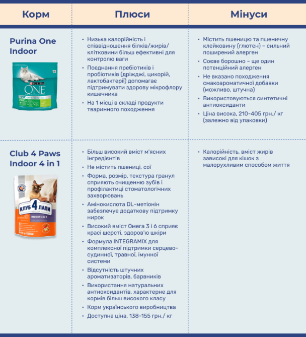 Висновок про корми Purina One та Клуб 4 Лапи для котів
