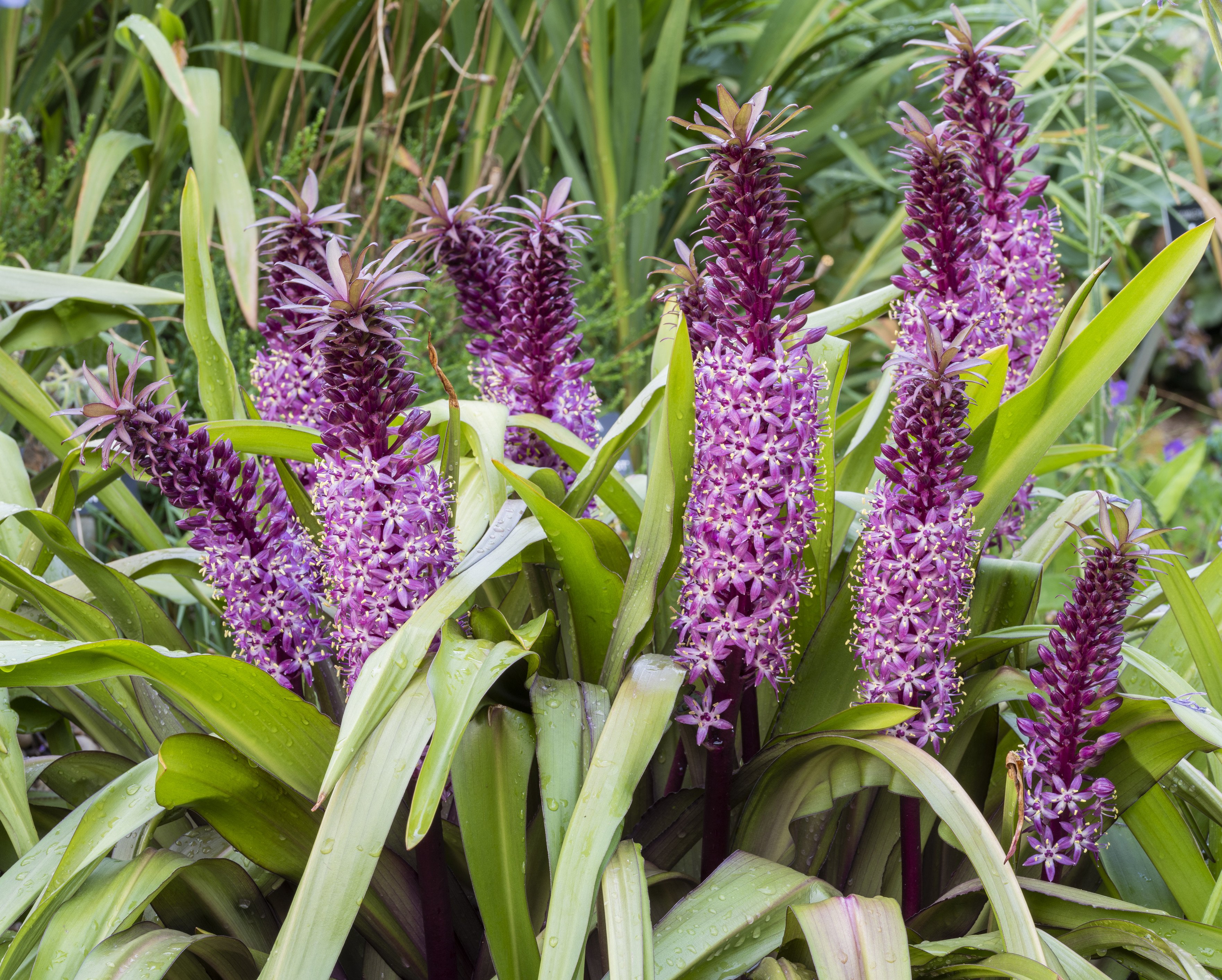 Масивні розетки довжиною 80 см, широке листя (спочатку бронзово-фіолетове), з якого виростають високі колоски бордово-рожевих зірок. За квітами йдуть більш ніжні фіолетово-чорні насіннєві коробочки.