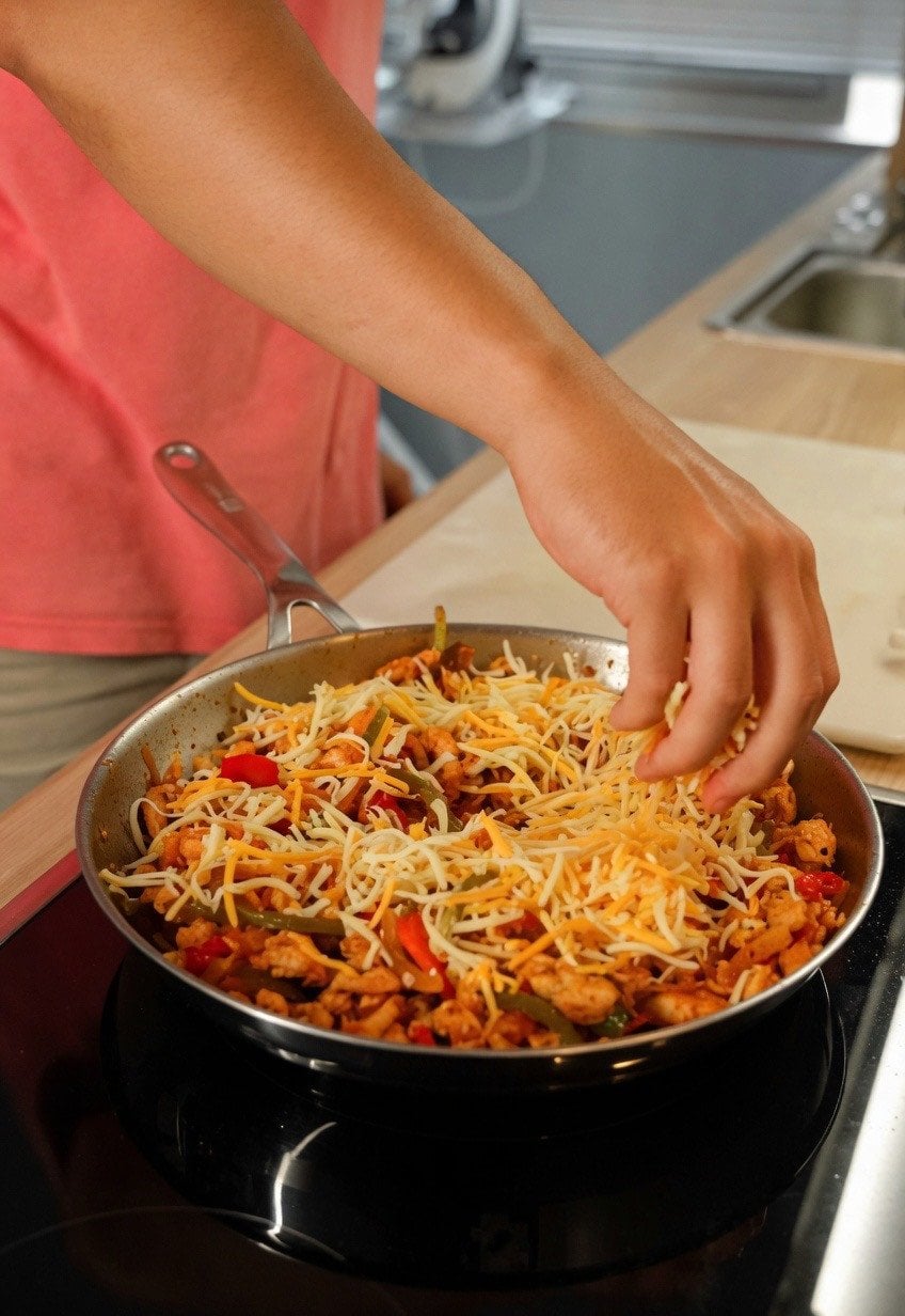 Поверніть курку до овочів, перемішайте та додайте жменю сиру.