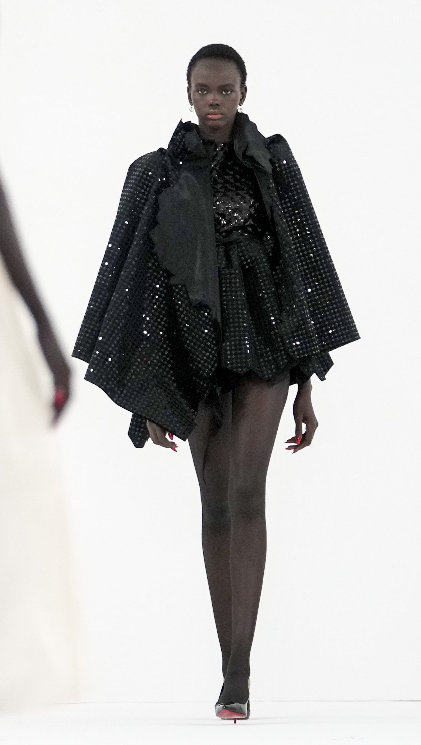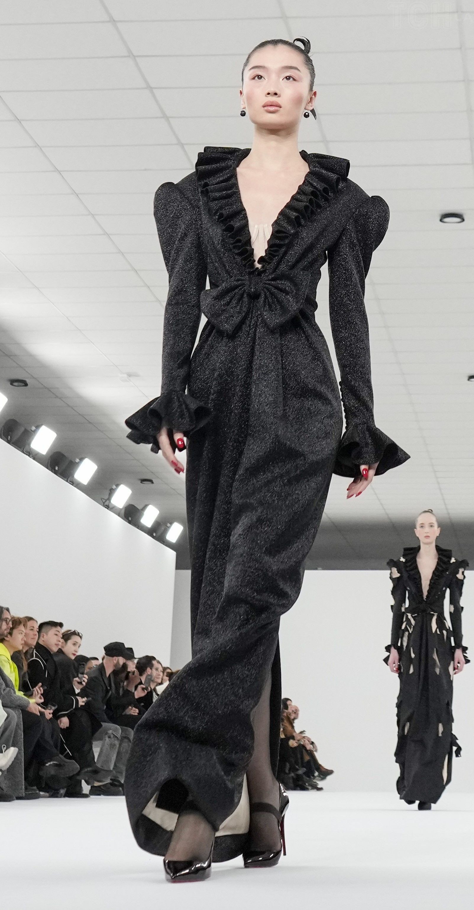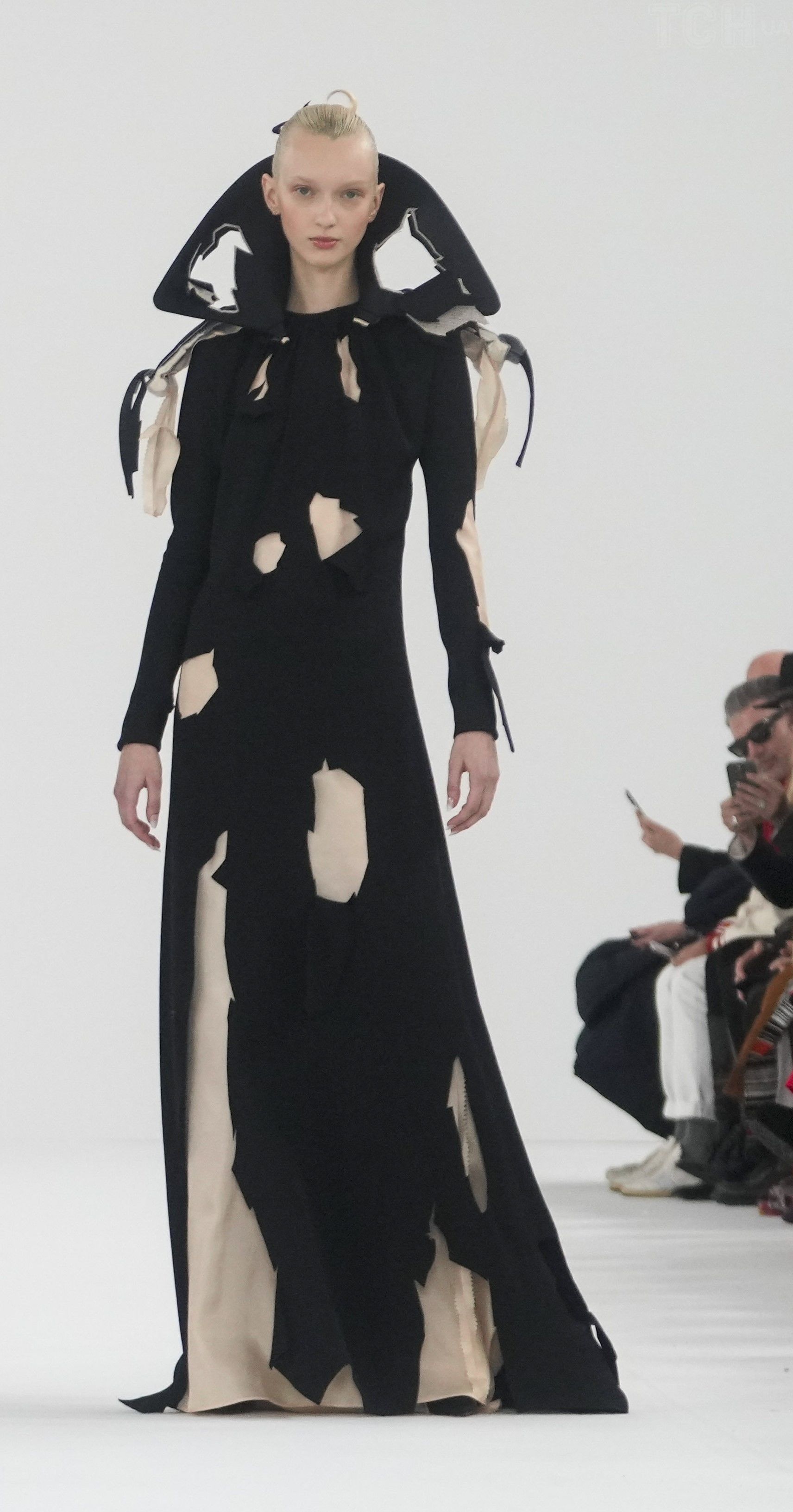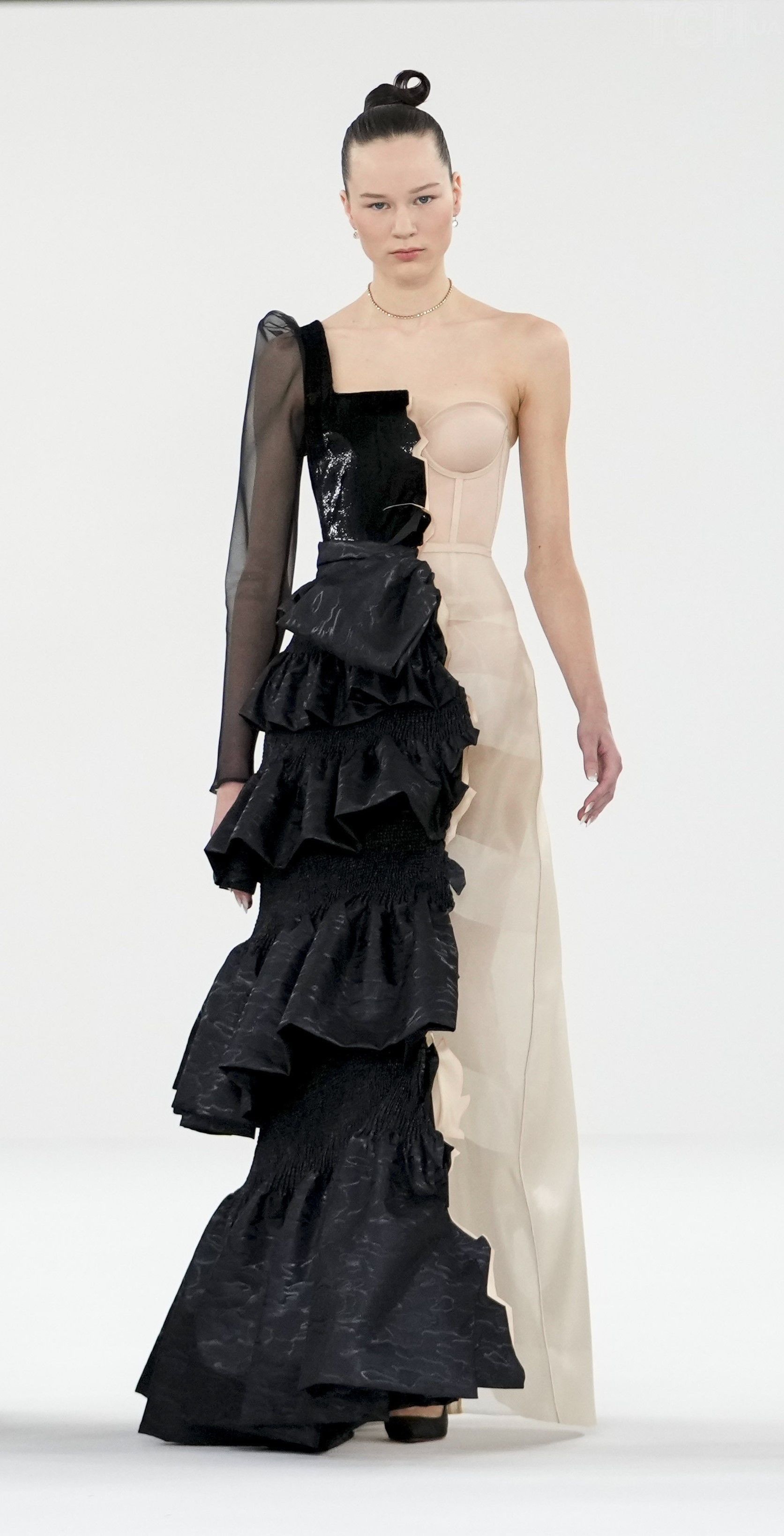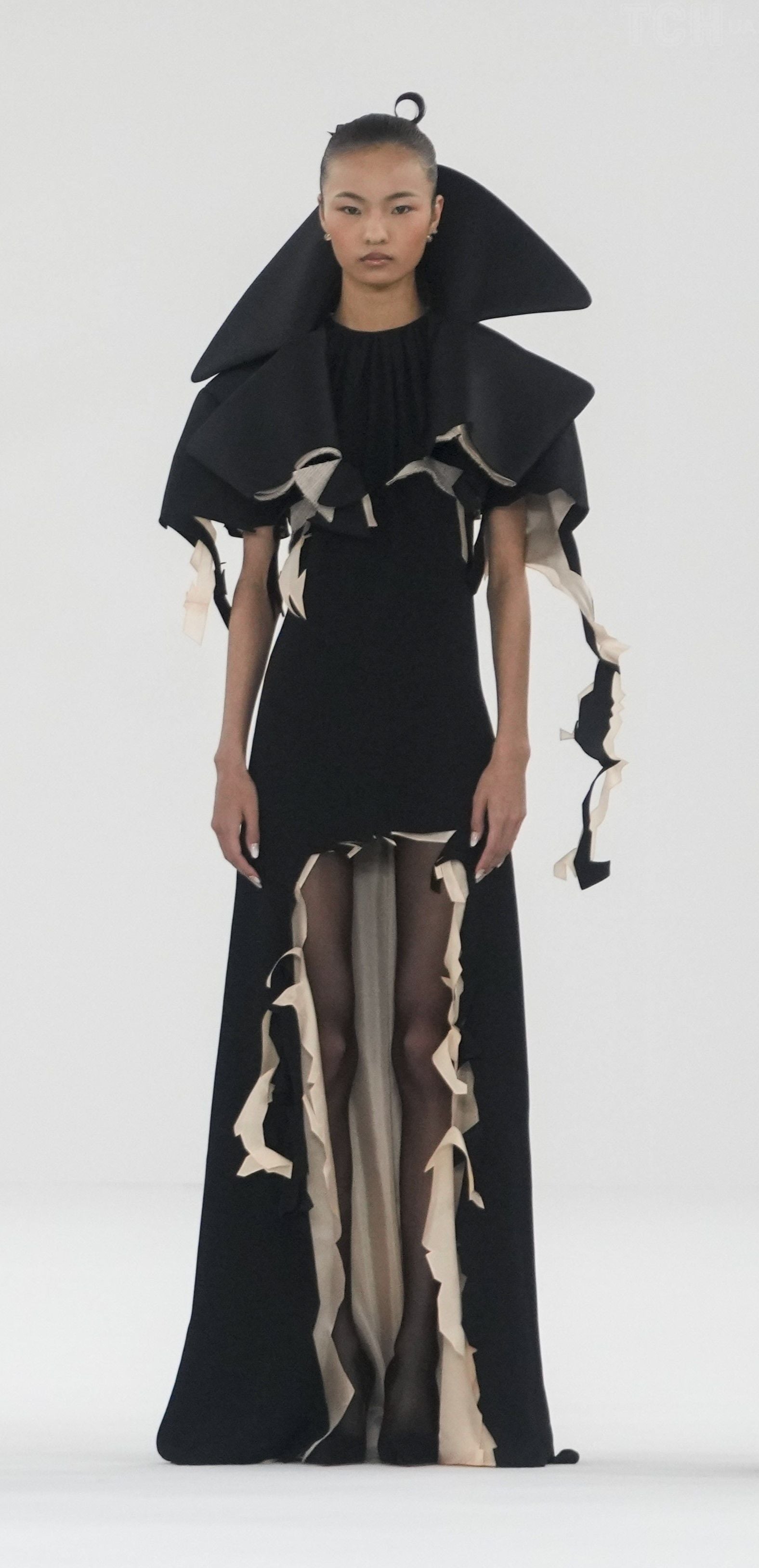 На подіумі можна побачити переважно чорні, білі та пудрові відтінки. Сукні в колекції були з рюшами, розшиті бісером, деякі з прозорими вставками, які імітували голе тіло. Однак також можна помітити кілька незвичайних моделей, що нагадували порізані сукні та пальта.