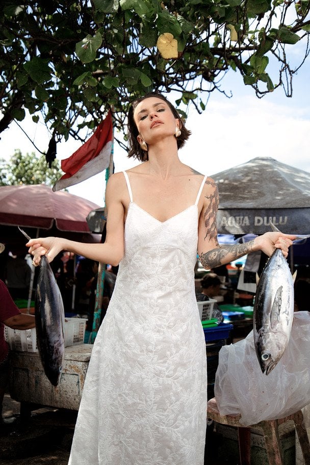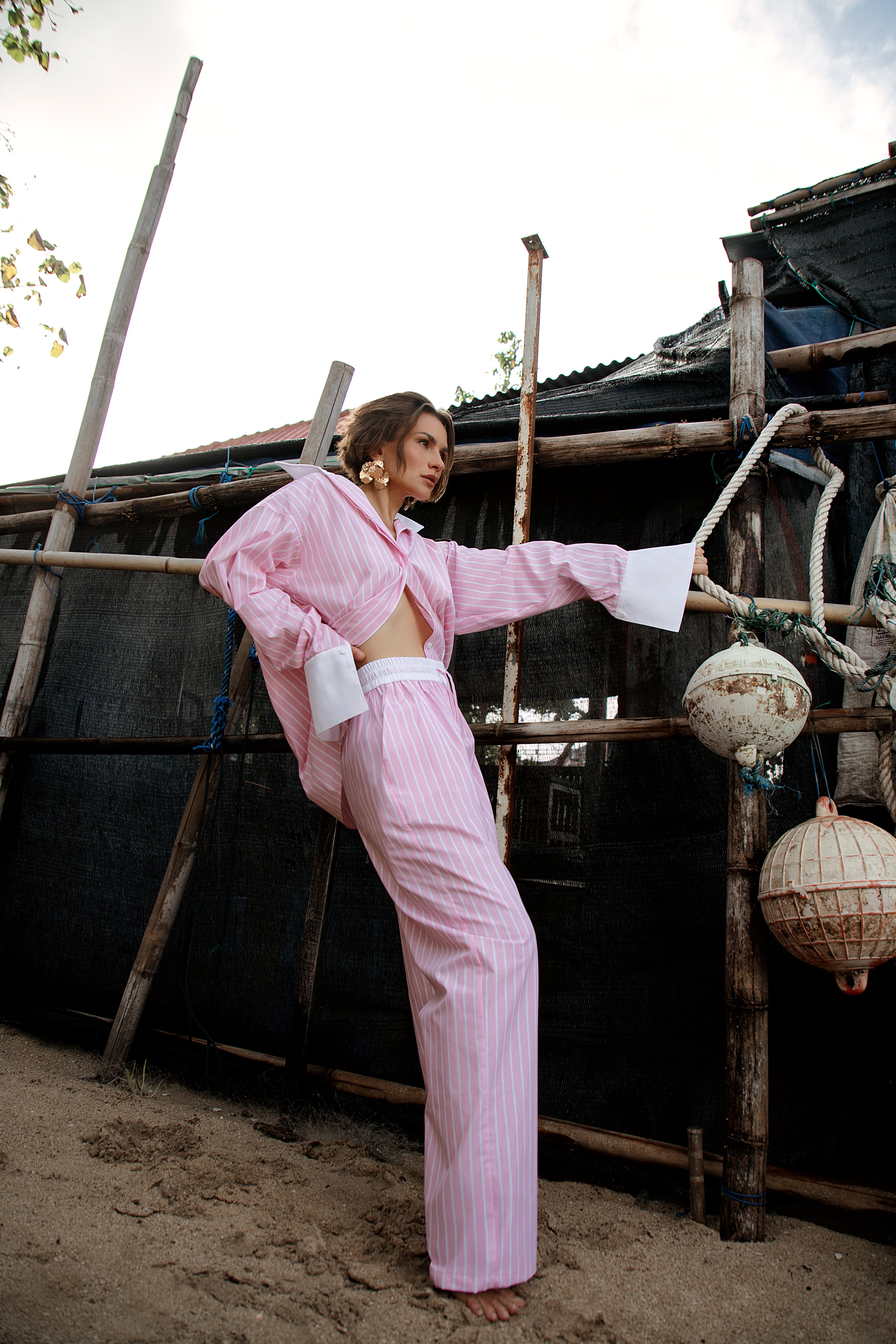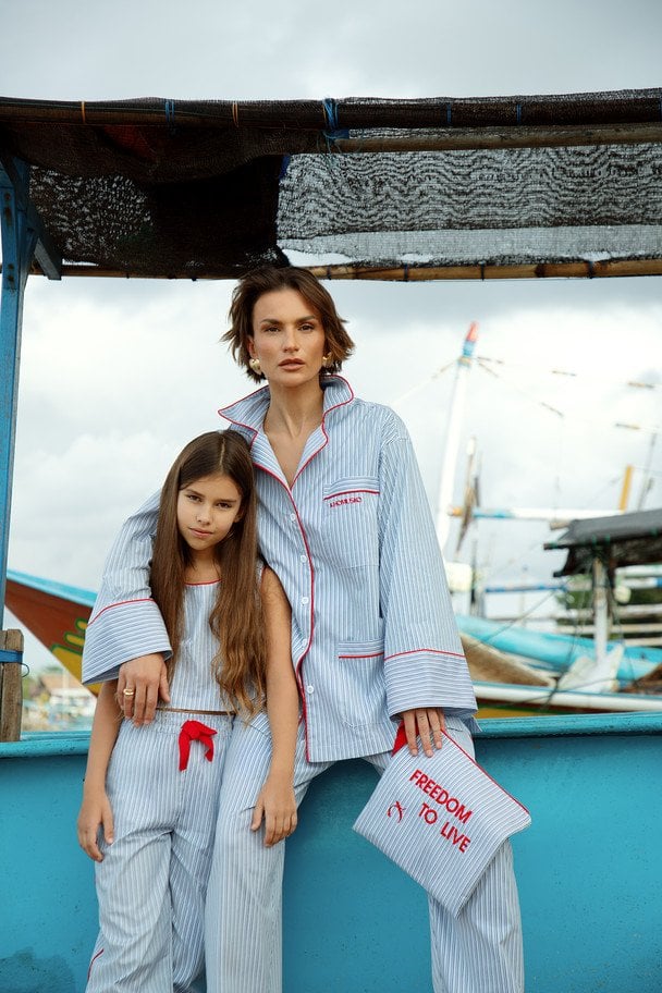 До лінійки увійшли піжами у смужку і біла сукня з вишивкою — лаконічні, функціональні предмети гардероба, які поєднують домашній комфорт із міською універсальністю.