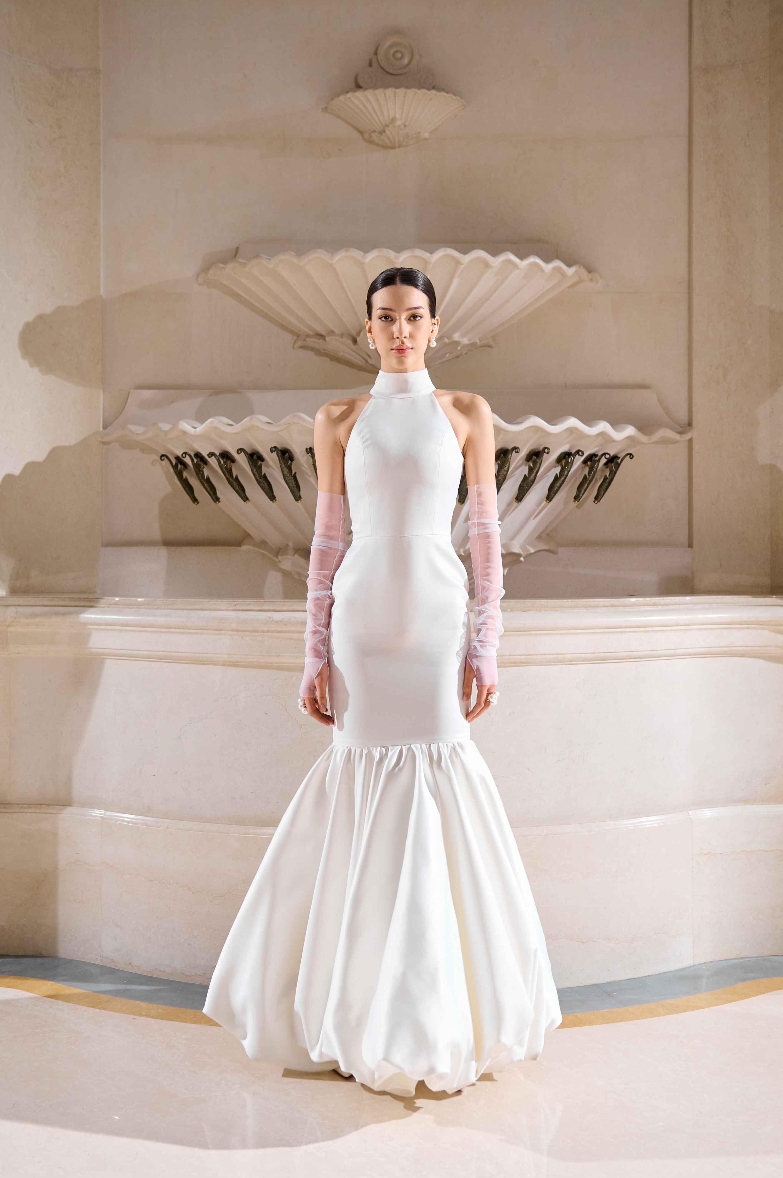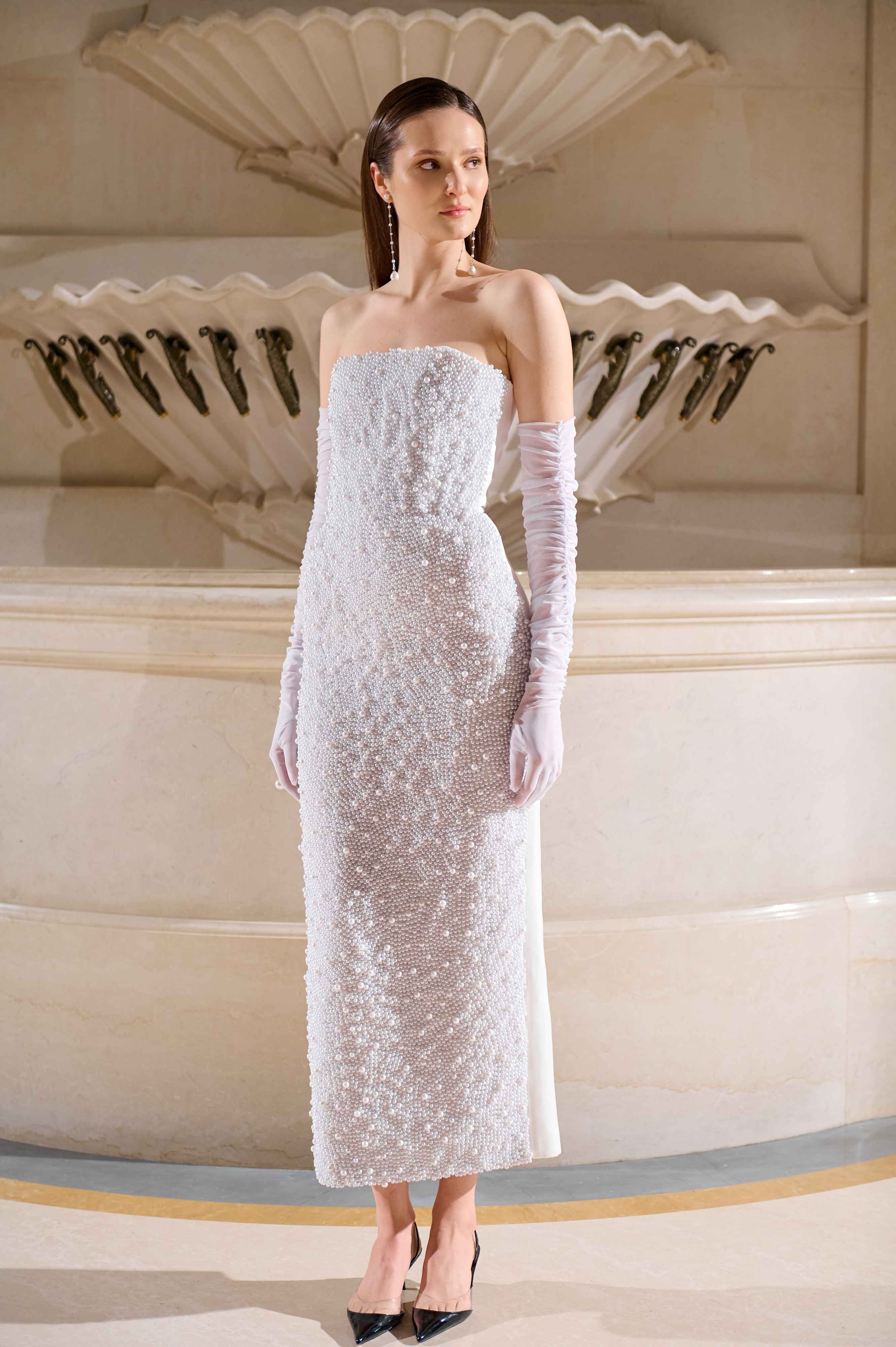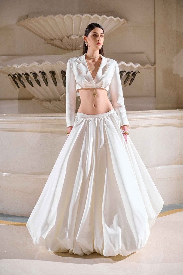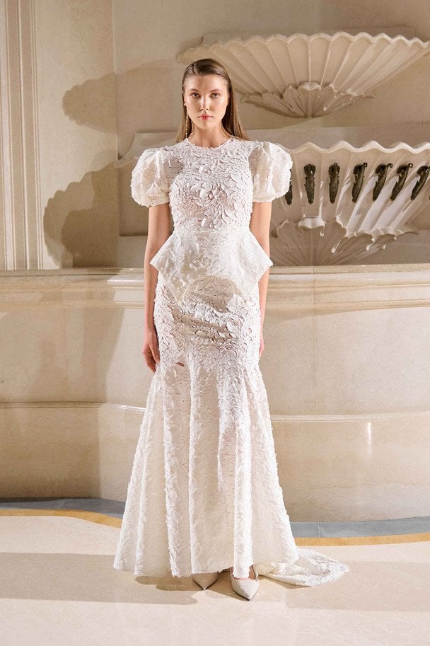 Головним луком колекції є сукня максі кольору айворі з іконічною баскою з декоративними підв’язками. Виконана з нової тканини з квітковим рельєфним візерунком, сукня поєднує в собі елементи корсета, скульптурну форму і насичену фактуру. Баска з підв’язками — один з найвпізнаваніших елементів бренду — підкреслює талію і стегна.