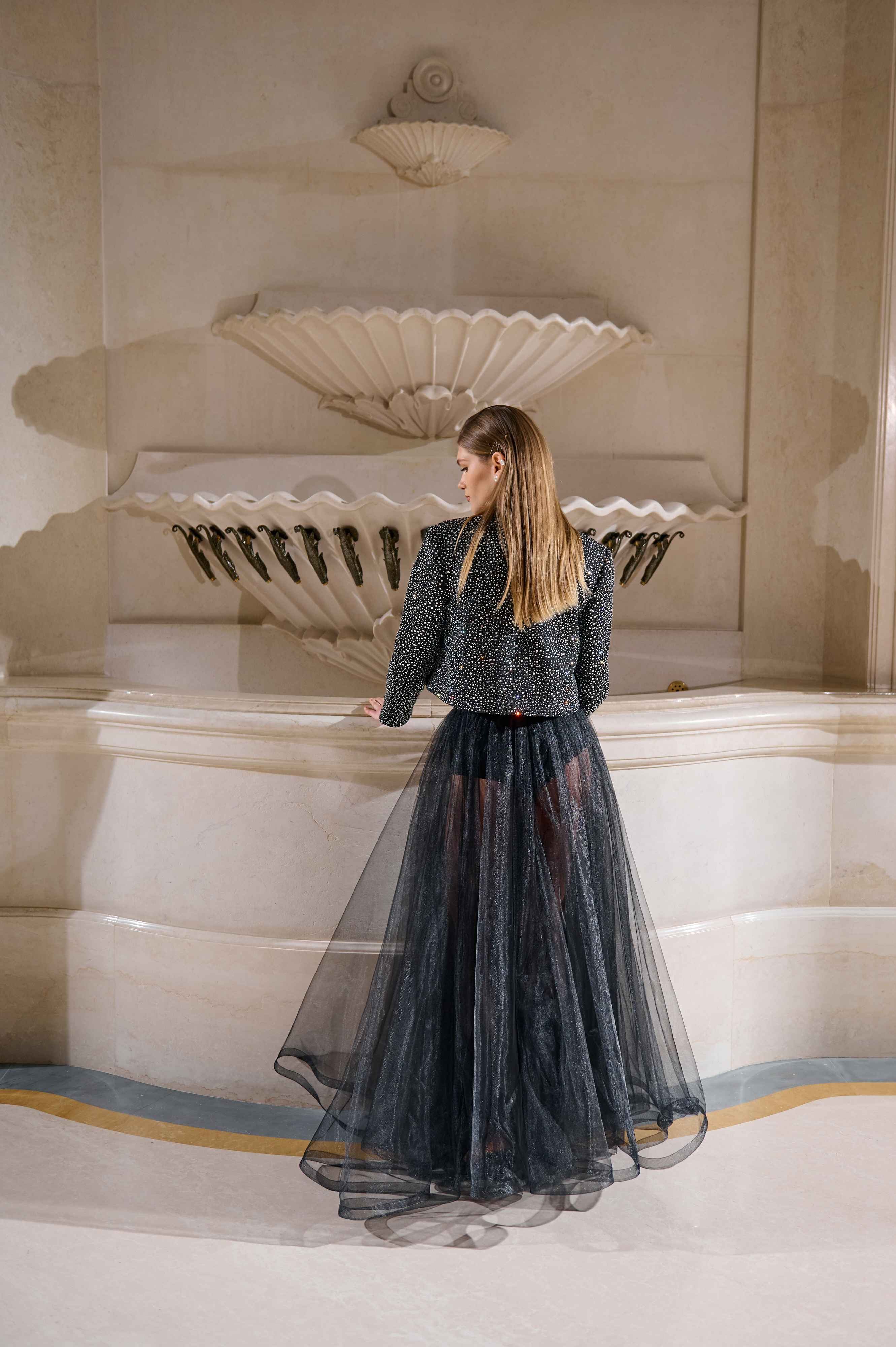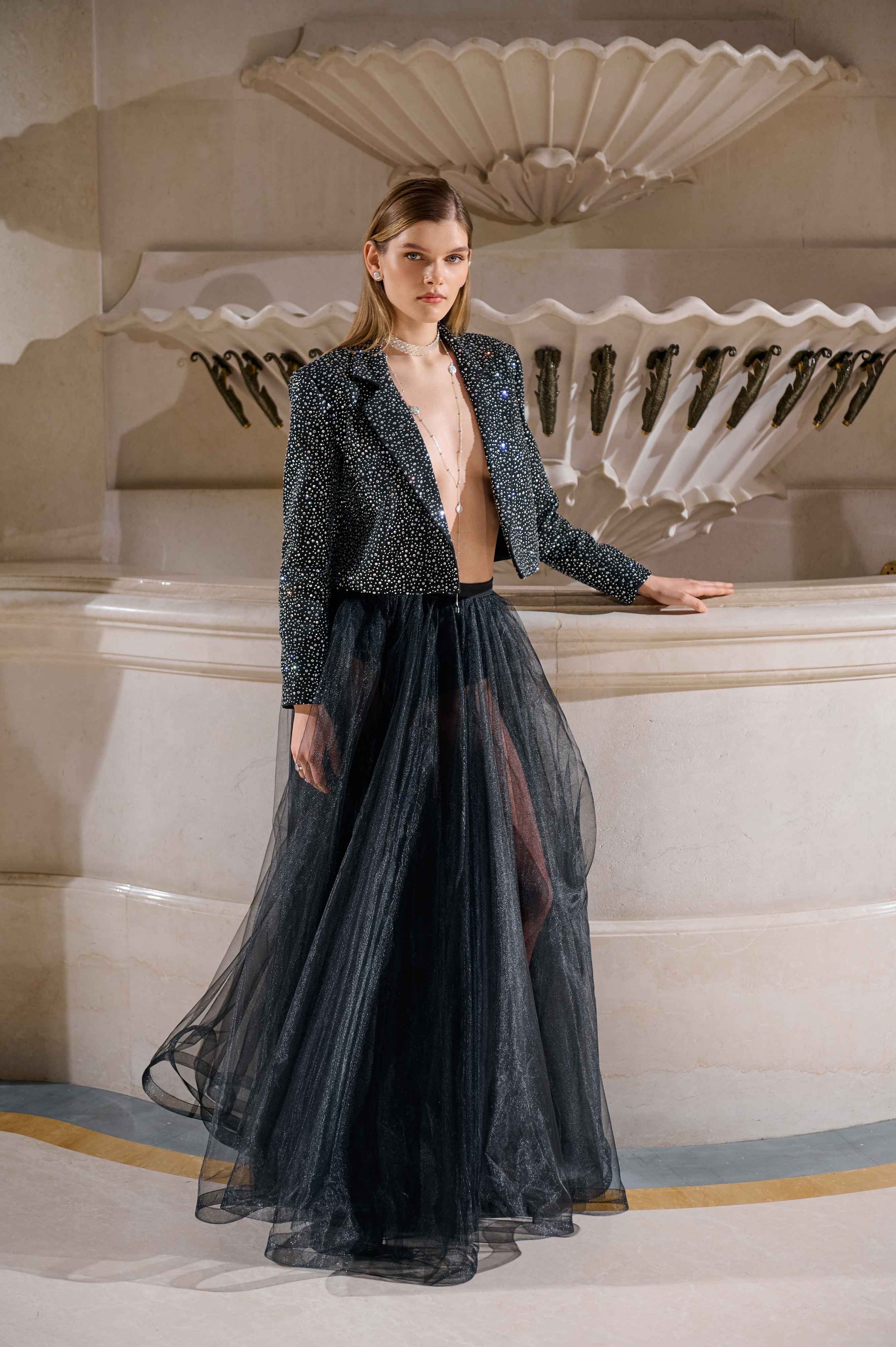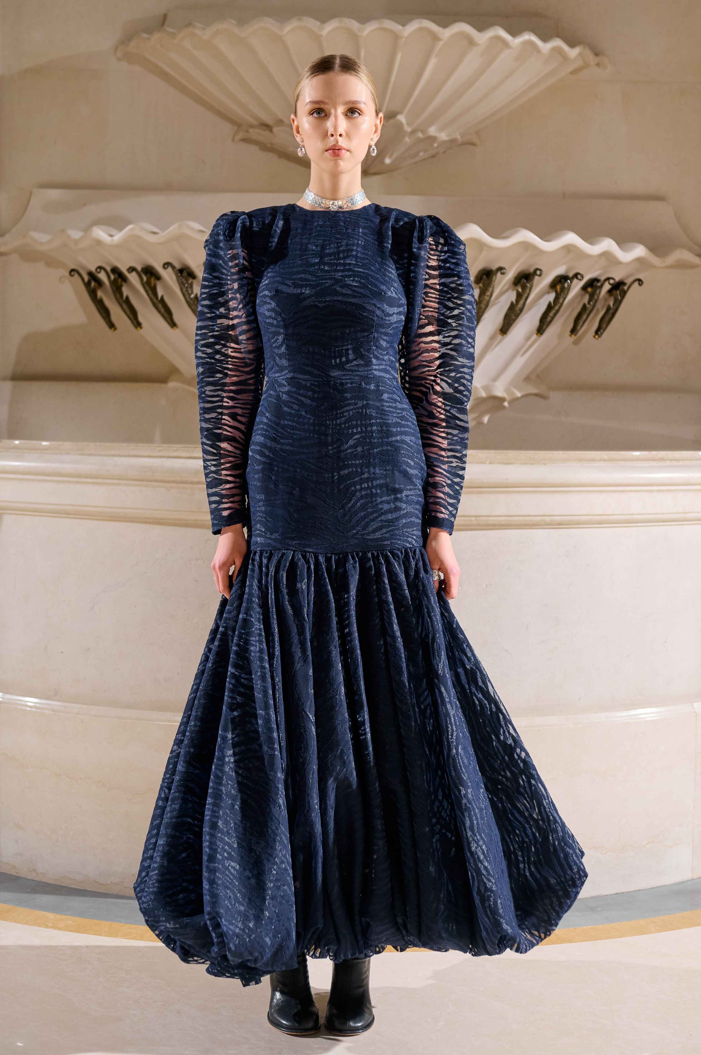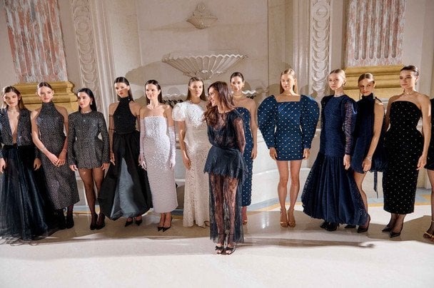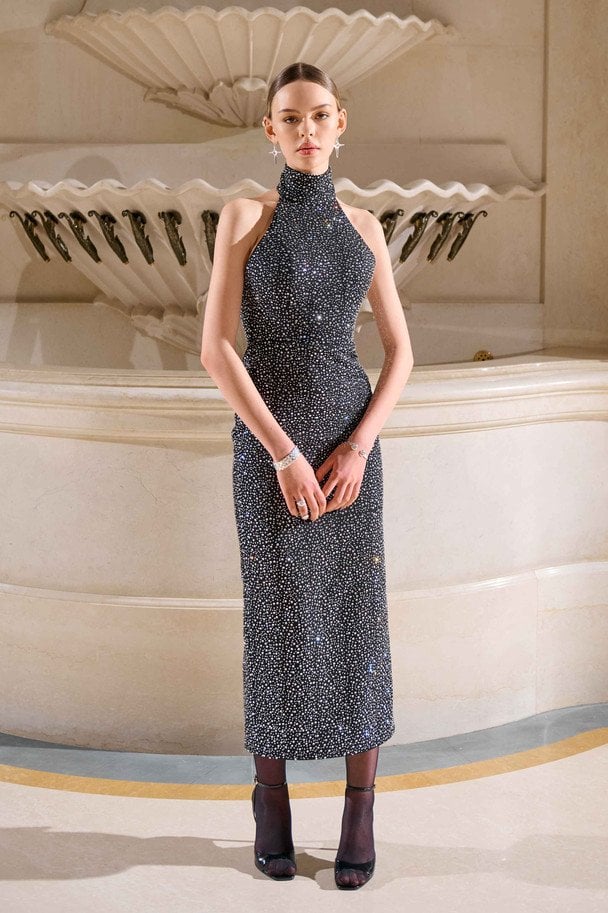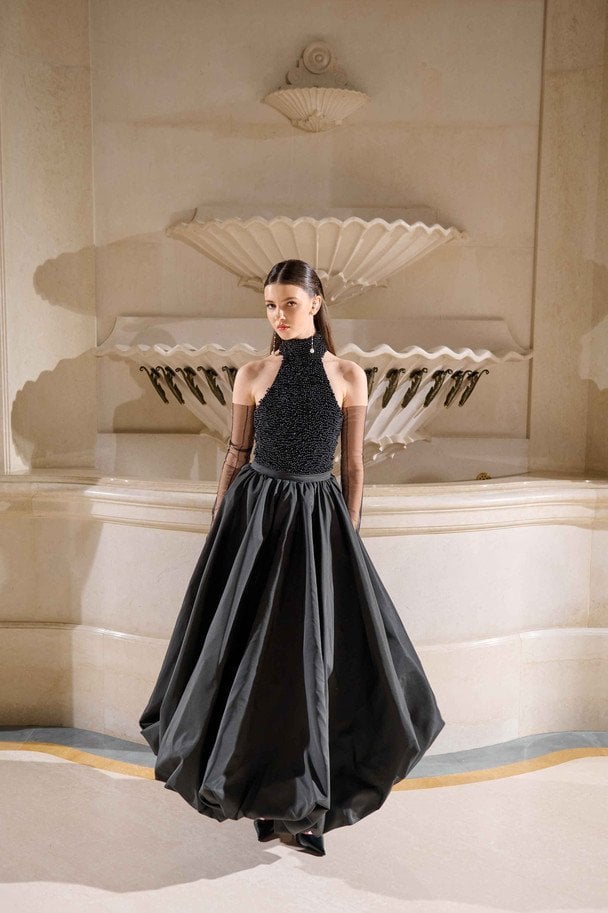 Палітра з чорного, насичено-синього та айворі, доповнена металевими бусинами і деталями, що відбивають світло, підкреслює драматичну вечірню естетику бренду.