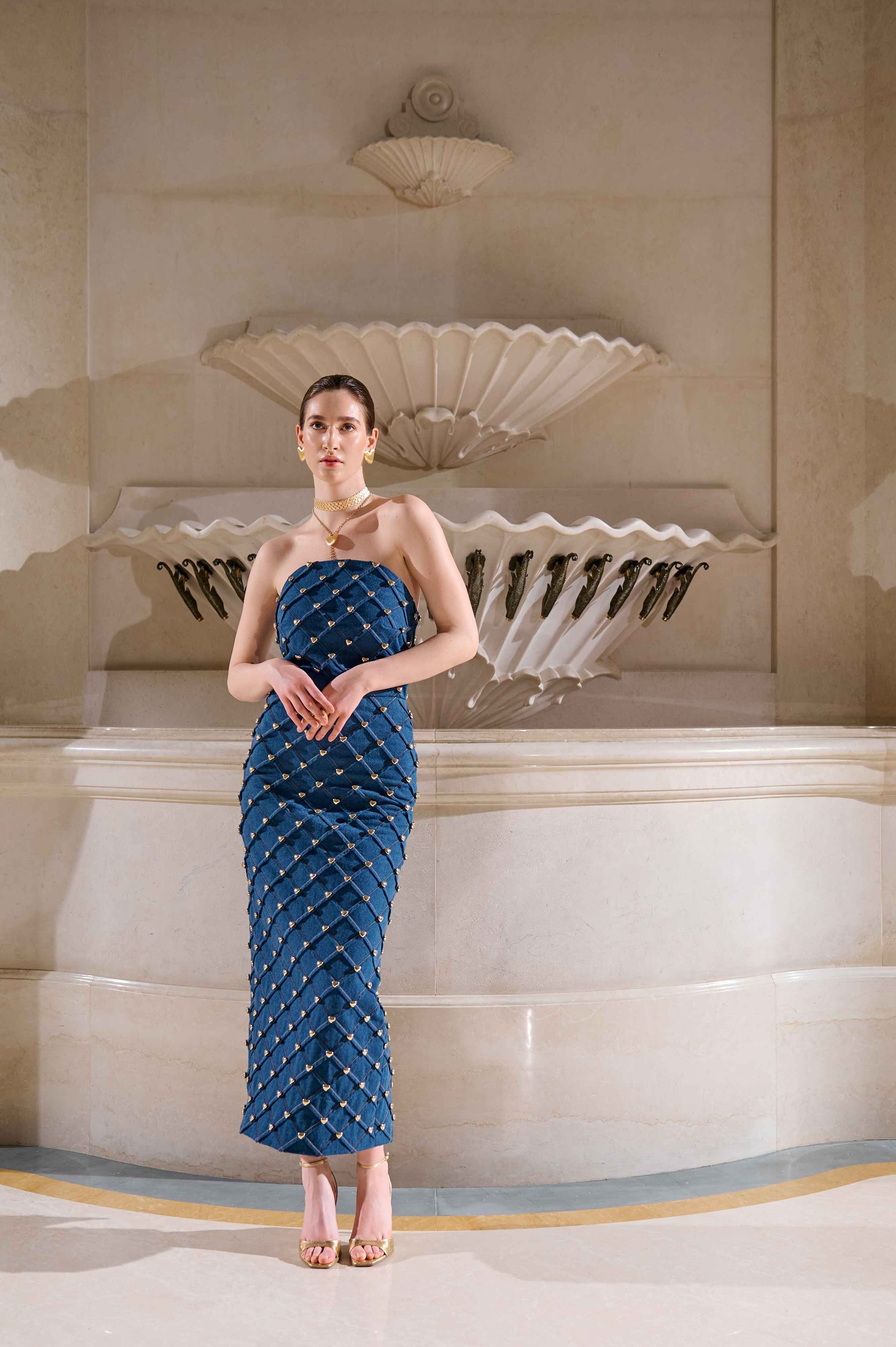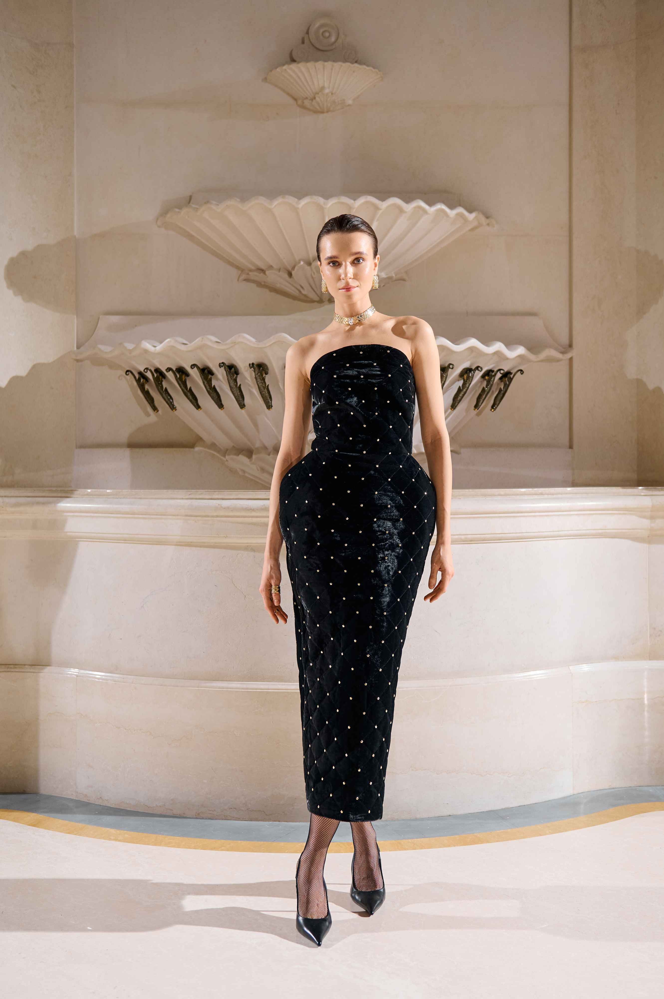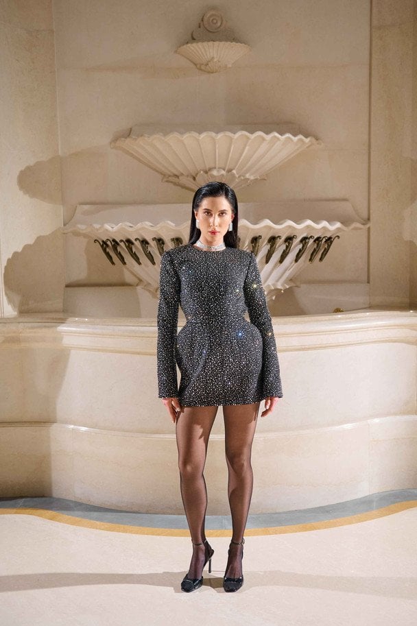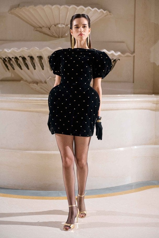 До лінійки увійшли структуровані сукні з акцентною лінією стегон, виразною талією та масивними плечима, які чітко обрамляють фігуру. Корсети залишаються центральним елементом образів, підкреслюючи архітектурність кожної конструкції. Важливу роль відіграють текстури: стрази, оксамит, стьобані візерунки і фактурні тканини створюють візуальну глибину та контраст.