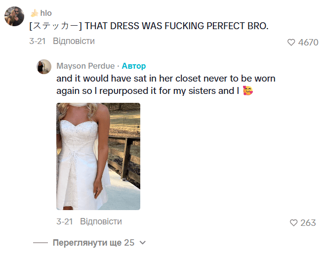 «Це твій день… але це була сукня твоєї мами, і вона була розкішною. Але якщо ви обидві щасливі — то гаразд»