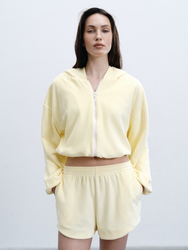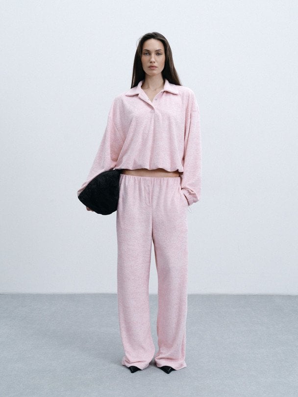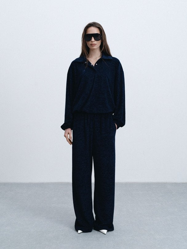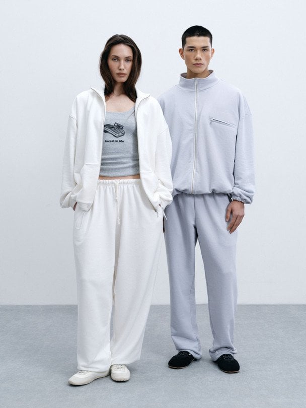 SS’26 об’єднує чоловічий, жіночий та унісекс напрями. Серед ключових позицій — унісекс-моделі з графічними принтами, чоловічі костюми у сіро-синій палітрі та жіночі комплекти в різноманітних текстурах: від м’якого велюру й махри до блискучого сатину та щільного котону.