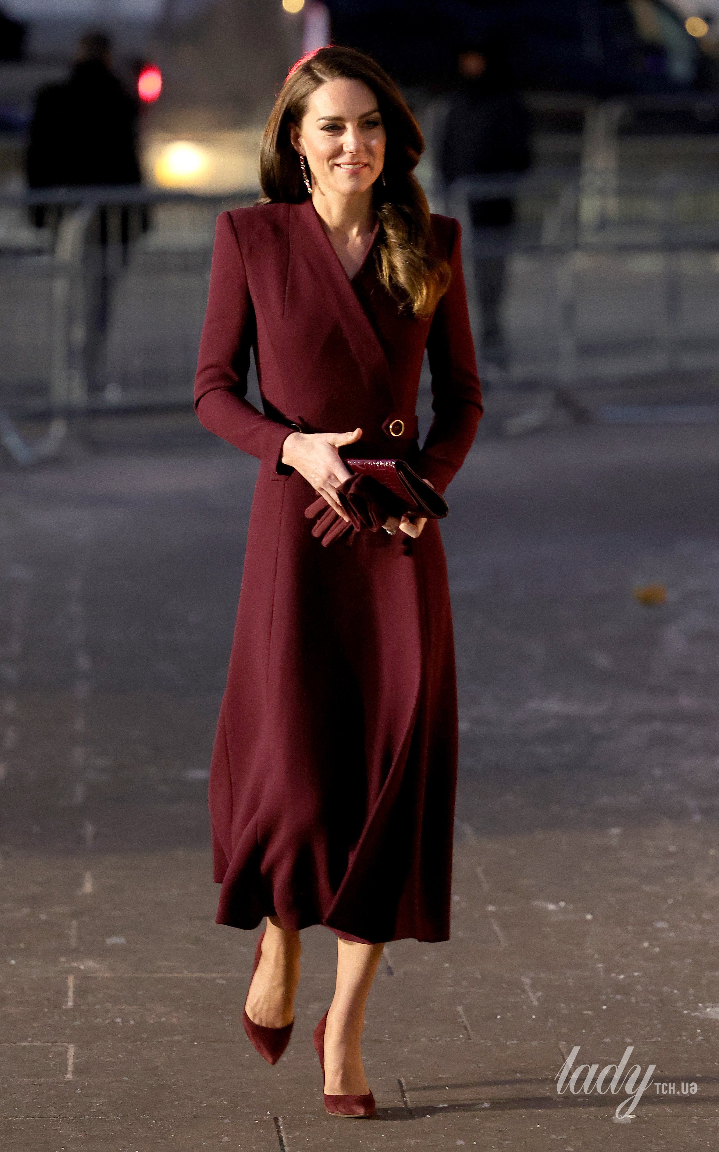 Дуже гармонійно Кейт поєднувала верблюже пальто з червоним трикотажним костюмом міді в рубчик і з чорним поясом на талії, а також високими чоботами із замші та клатчем. На ній був светр із кашеміру від Gabriela Hearst вартістю 790 доларів та спідниця довжини міді в тон від цього ж бренду за 1590 доларів. Зверху принцеса одягла кашемірове пальто від Massimo Dutti за 430 доларів.