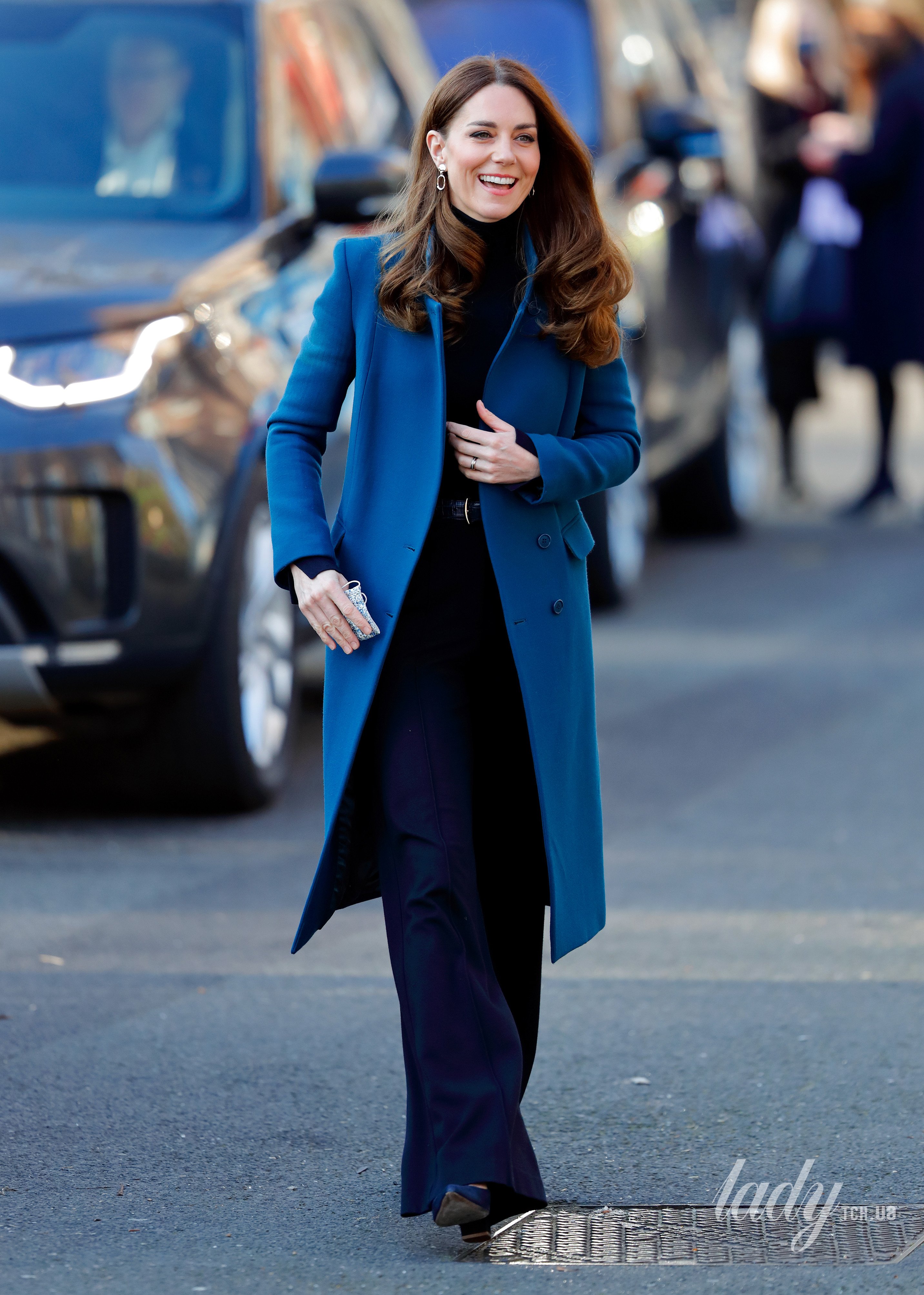 Принцеса носила того дня синє пальто, поєднуючи його з улюбленими штанями-кльош від Jigsaw, поясом, чорною водолазкою та синіми замшевими гостроносими туфлями на стійких підборах. Як бачимо, Кетрін частіше полюбляє носити взимку туфлі, ніж чоботи, особливо, якщо їй не доведеться багато часу провести на вулиці.