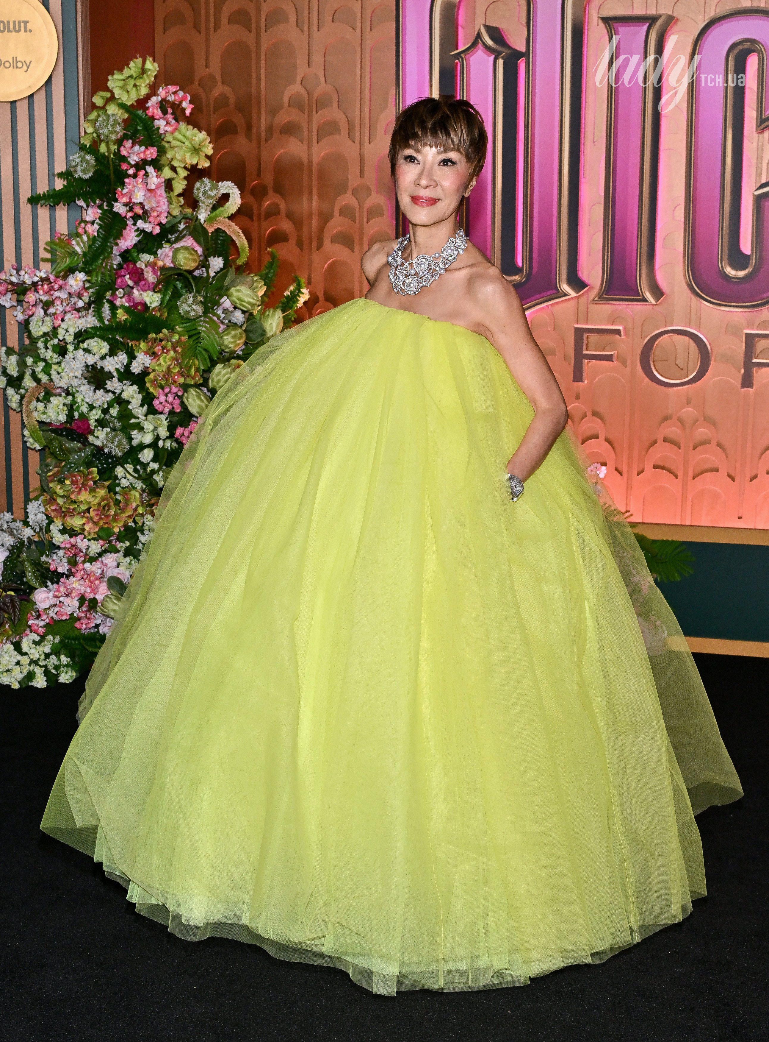 Зірка фільму «Wicked: Чародійка» прийшла на прем’єру другої частини фільму у величезній сукні яка нагадувала кулю. Це лимонне вбрання було створене брендом Givenchy для колекції весна-літо 2026.