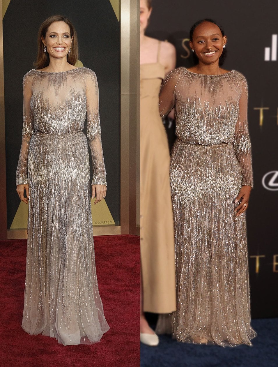 Донька голлівудської суперзірки переробила сукню від Elie Saab з вишивкою для появи на прем’єрі фільму. Анджеліна Джолі носила це вбрання 2014 року на червоній доріжці церемонії «Оскар».