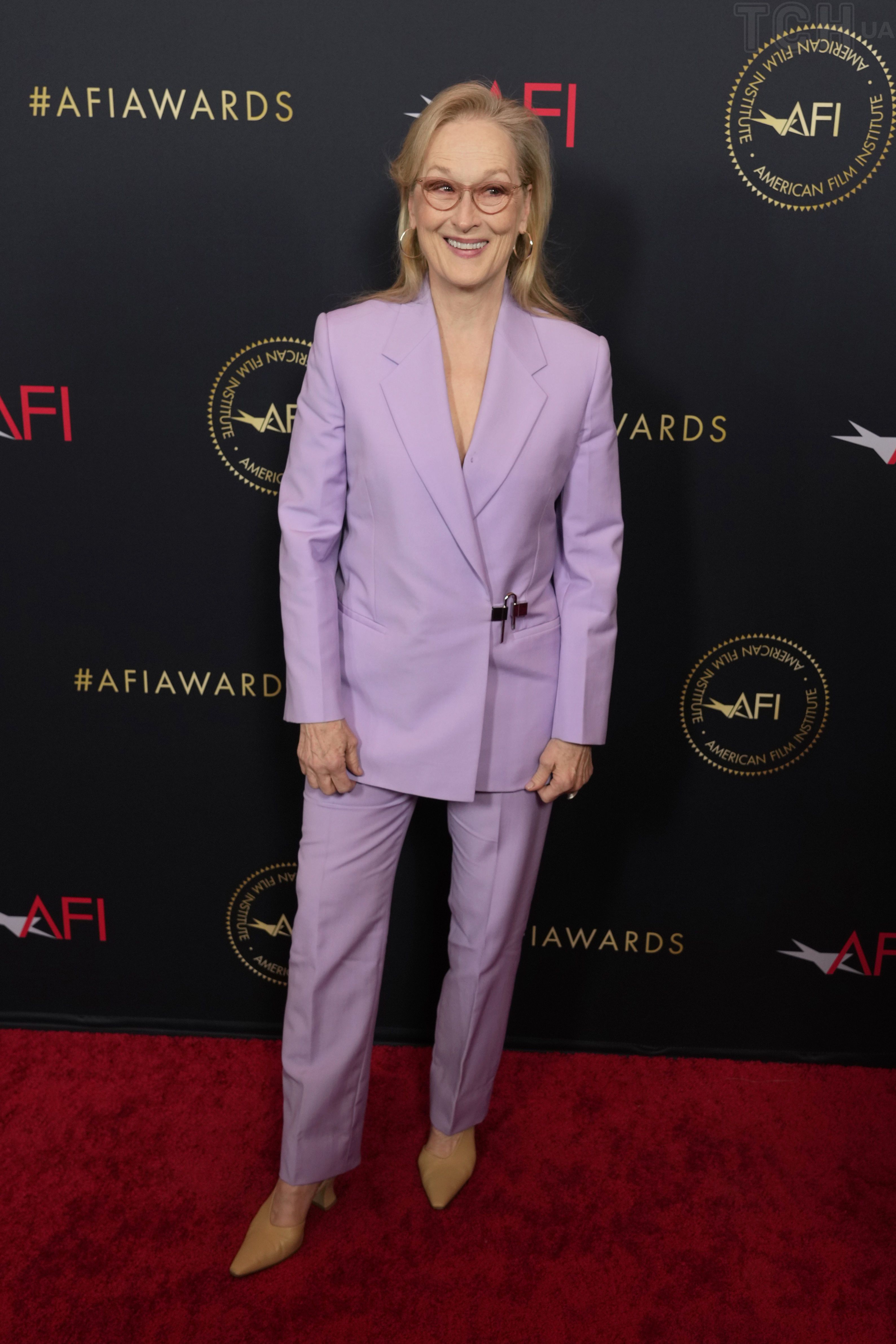 Акторка позувала у розкішному вбранні від Louis Vuitton з оригінальним жакетом на заході AFI Awards Luncheon. Образ вона доповнила квадратною сумкою.