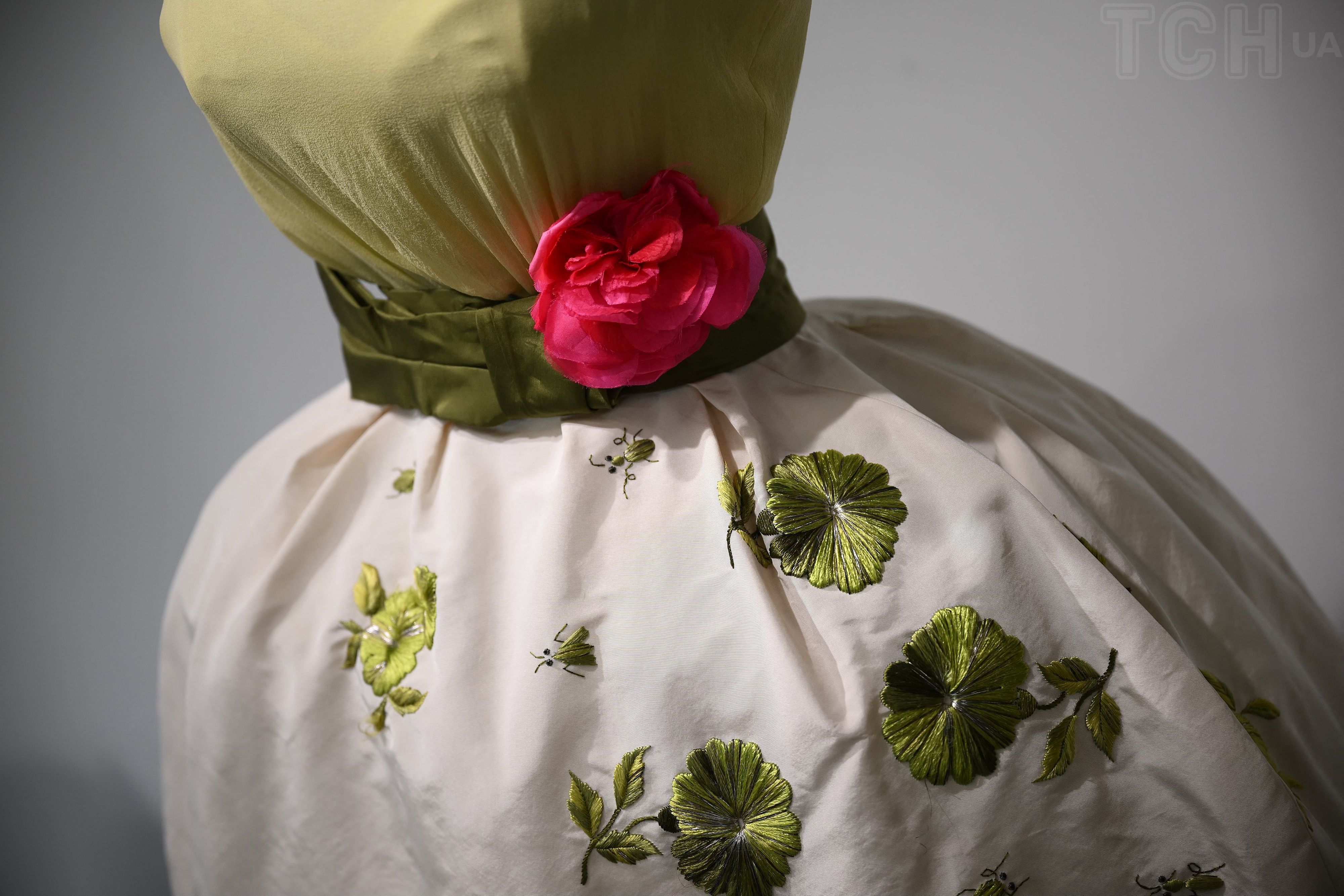 Кутюрна сукня зірки була виконана у двох кольорах — верхній топ був ніжно-салатового відтінку, а спідниця була білою та у формі тюльпана. Талія вбрання була яскраво виражена, її також прикрашав широкий зелений пояс та малинова квітка з тканини. З одного боку спідницю прикрашала вишивка гладдю у вигляді квітів та невеликих жуків.